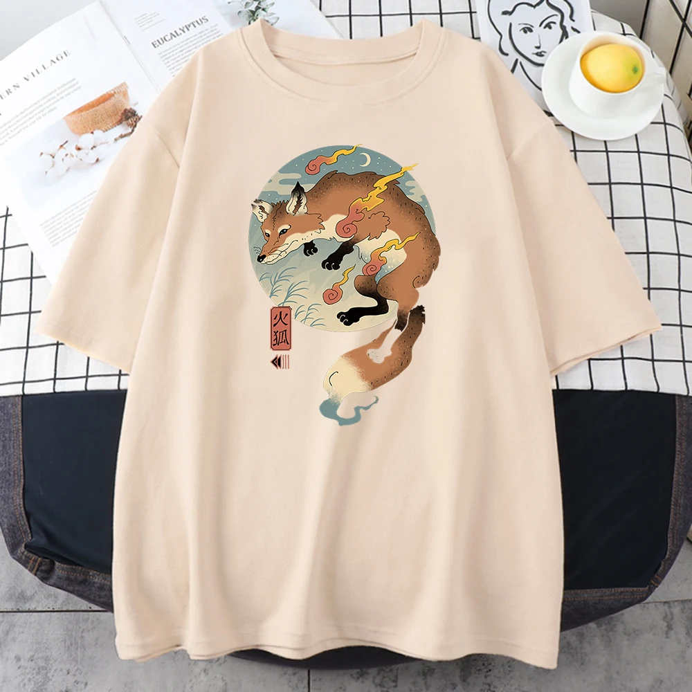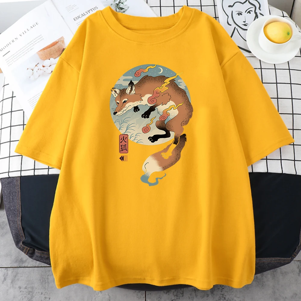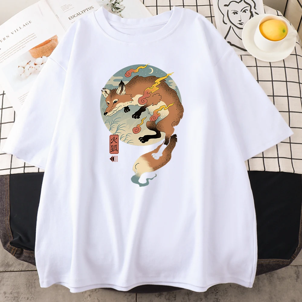 Женская футболка с принтом укийое Fire Fox, Повседневная футболка с круглым вырезом и коротким рукавом, дышащие свободные мужские футболки