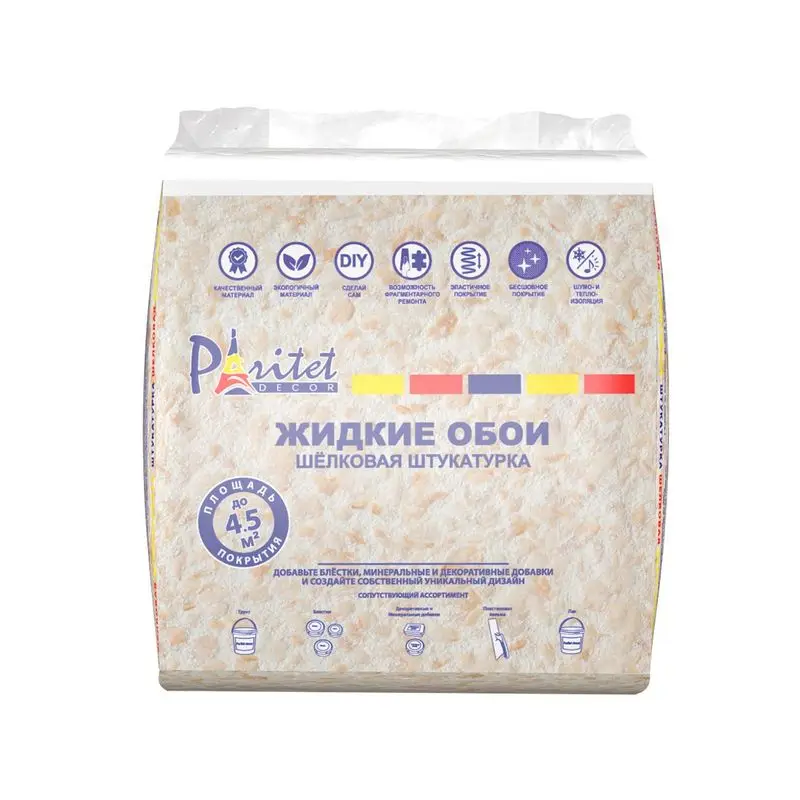 Время Просушки 72 часа Название бренда Paritet Происхождение Россия Вид материала 1 Жидкие обои Структура поверхности мелкорельефная Вид материала 2 Декоративная штукатурка Особенность Легкое нанесениевнешний вид товара