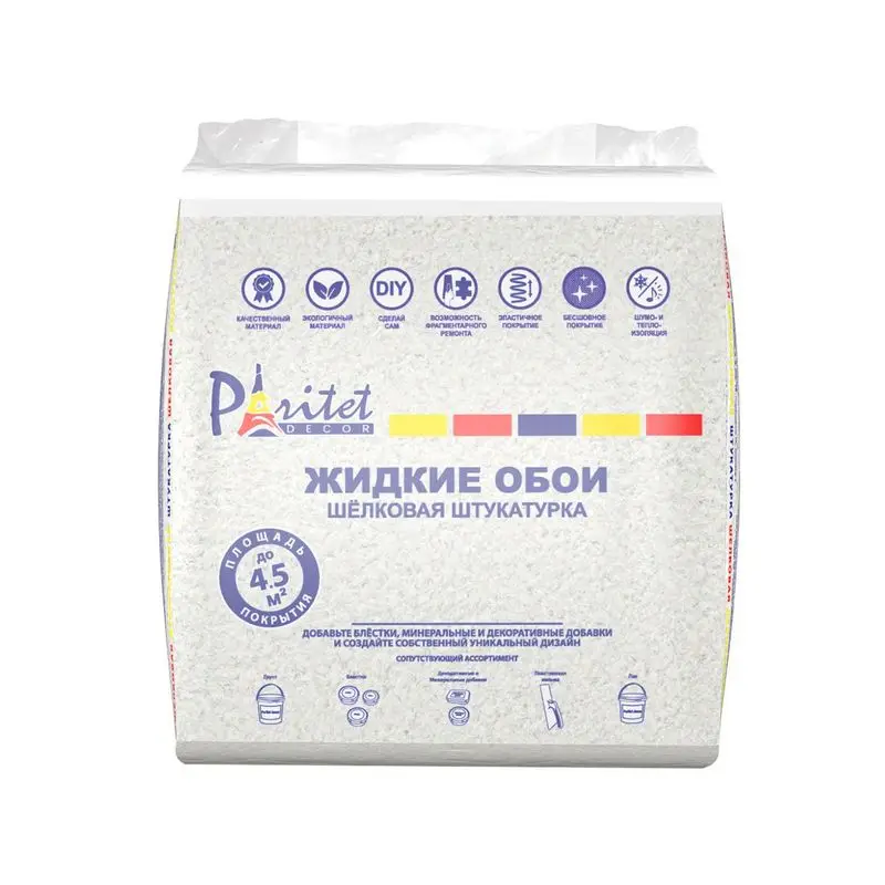Время Просушки 72 часа Название бренда Paritet Происхождение Россия Вид материала 1 Жидкие обои Структура поверхности крупнорельефная Вид материала 2 Декоративная штукатурка Особенность Легкое нанесениевнешний вид товара