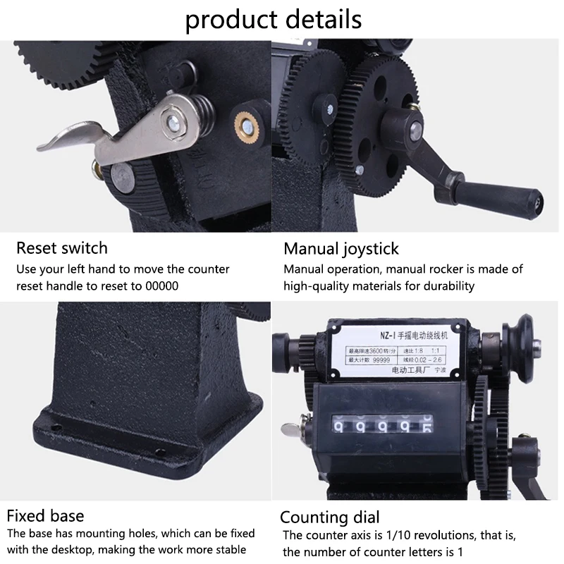 Машинка для намотки с ручным счетчиком приводится в движение ведущей шестерней рукоятки для управления главным валом, а счетчик подсчитывается ведущей шестерней без главной коробки передач. Коэффициент скорости главного вала и встречного вала-10:1. При вращении основного вала 1, встречный вал составляет 1/10 оборотов. То есть количество букв в счетчике-1 оборот.