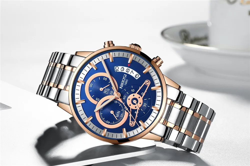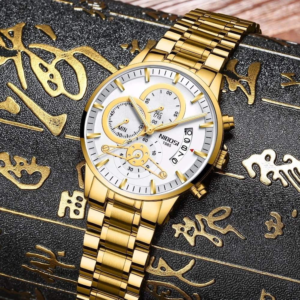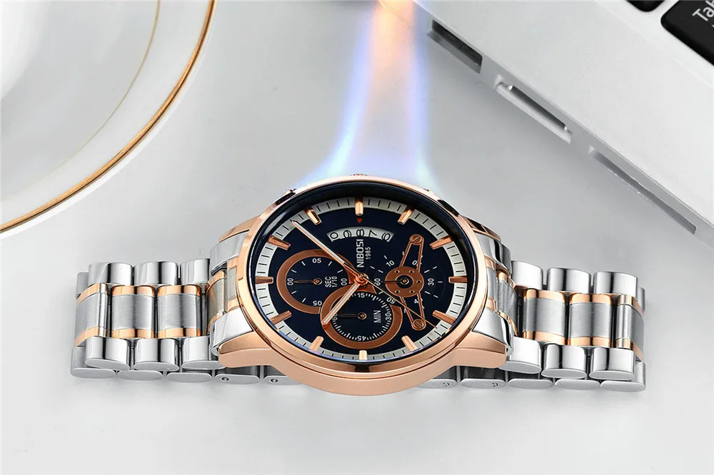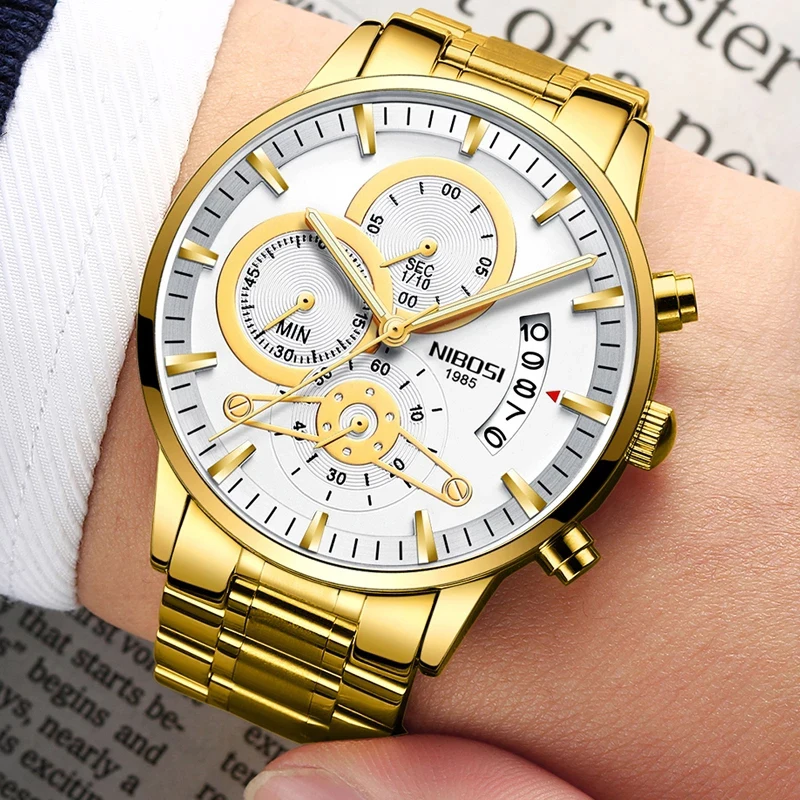 NIBOSI Для мужчин часы Нержавеющаясталь хронограф кварцевые часы Для Мужчин Светящиеся Водонепроницаемый золото спортивные часы мужские часы Relogio Masculino