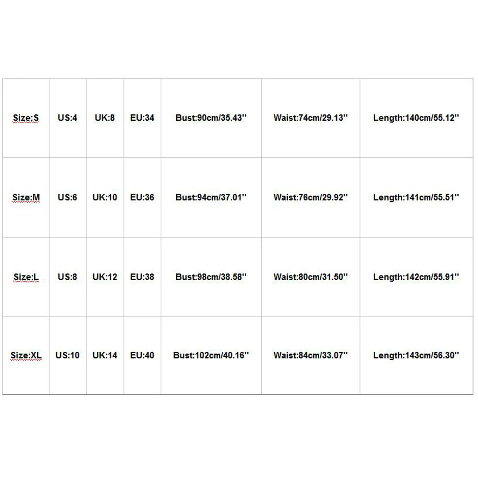 Размер: S США: 4 Великобритания: 8 ЕС: 34 Обхват груди: 90 см/35,43 дюйма Талия: 74 см/29,13 дюйма Длина: 140 см/55,12'' Размер: M США: 6 Великобритания: 10 ЕС: 36 Обхват груди: 94 см/37,01 дюйма Талия: 76 см/29,92 дюйма Длина: 141 см/55,51 дюйма Размер: L США: 8 Великобритания: 12 ЕС: 38 Обхват груди: 98 см/38,58 дюйма Талия: 80 см/31,50 дюйма Длина: 142 см/55,91'' Размер: XL США: 10 Великобритания: 14 ЕС: 40 Обхват груди: 102 см/40,16 дюйма Талия: 84 см/33,07 дюйма Длина: 143 см/56,30''