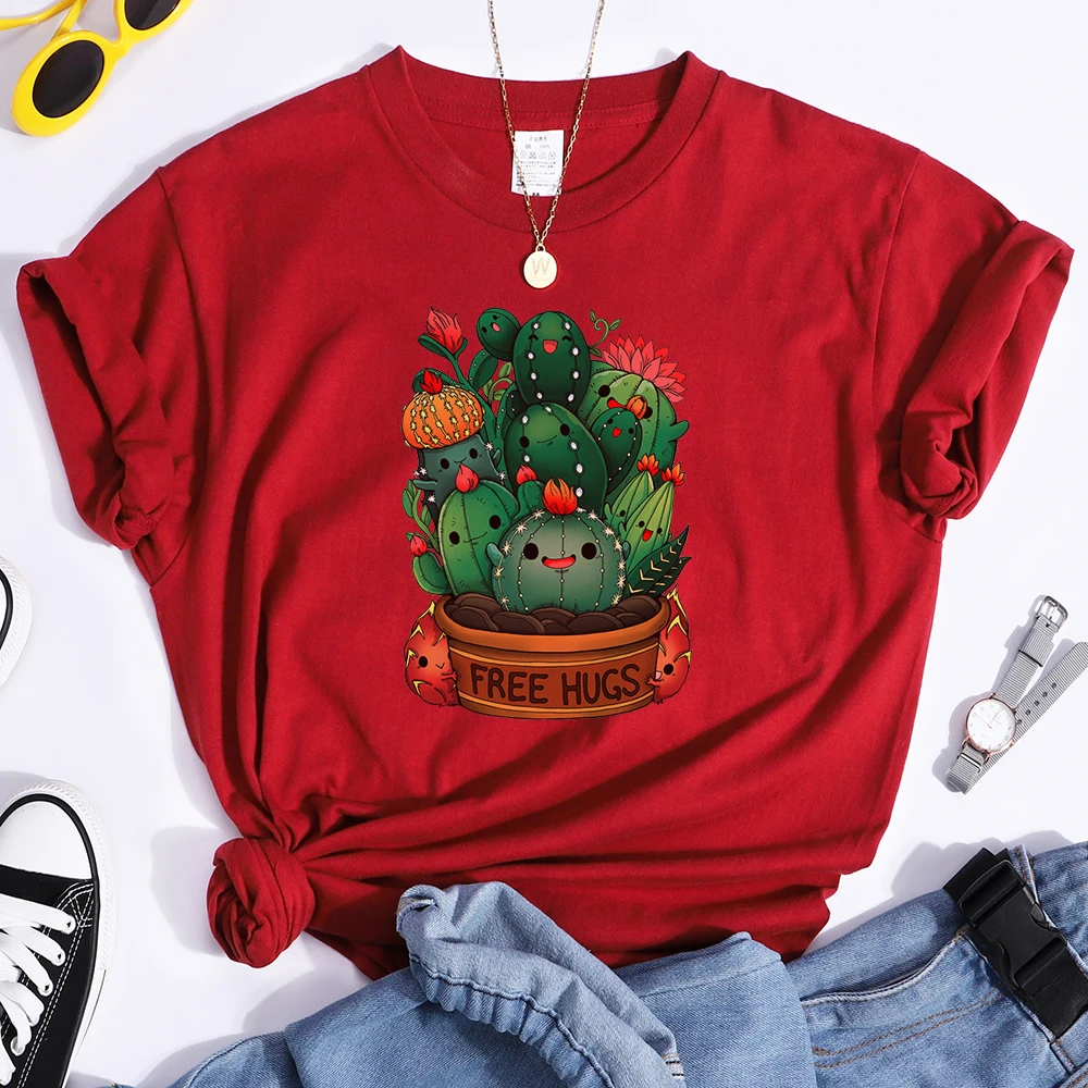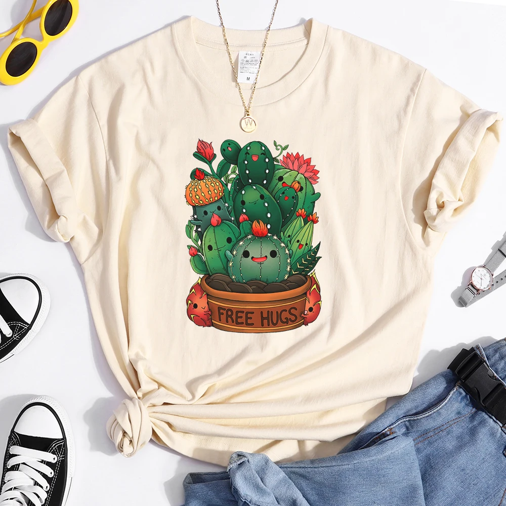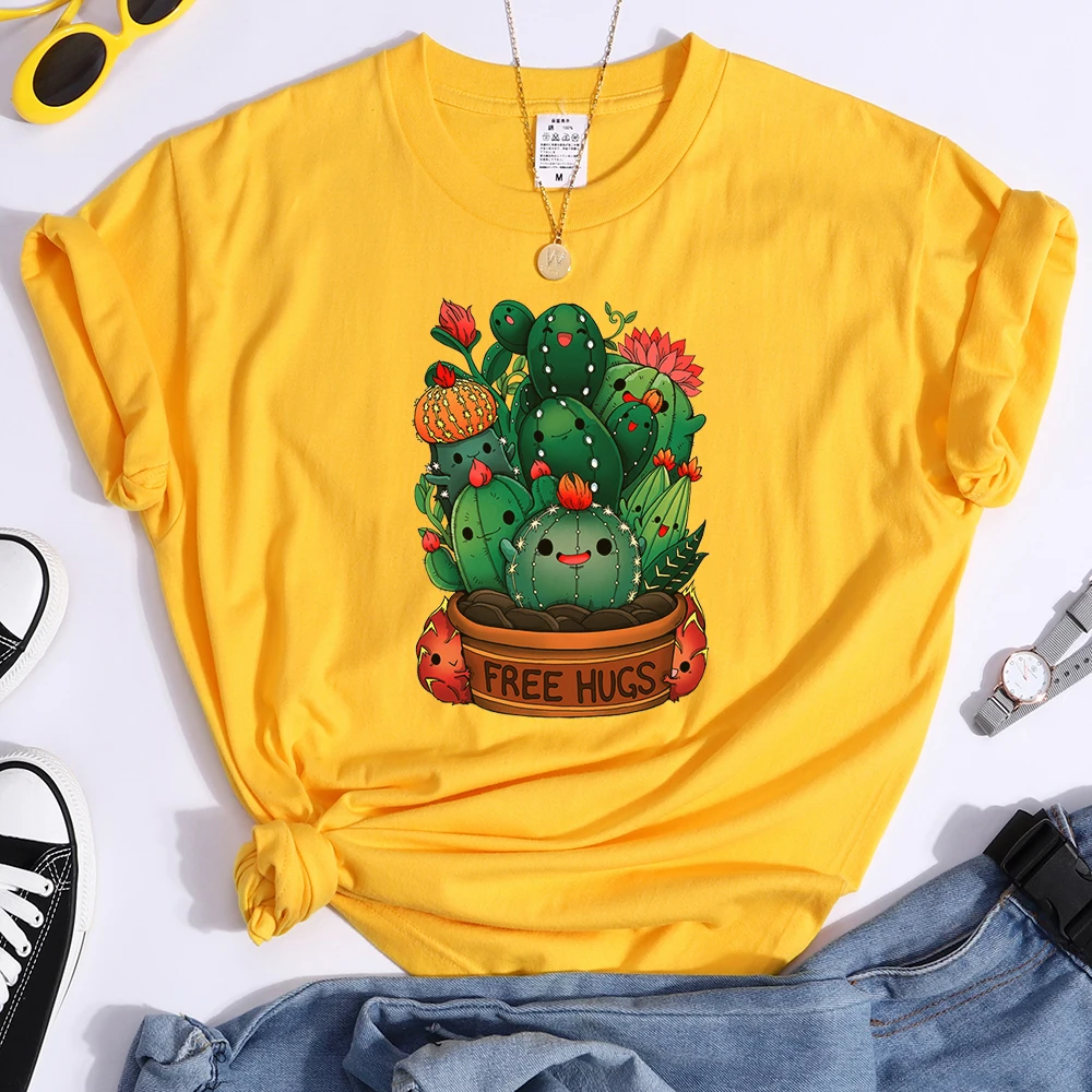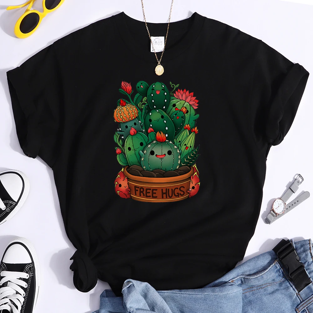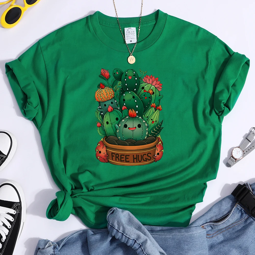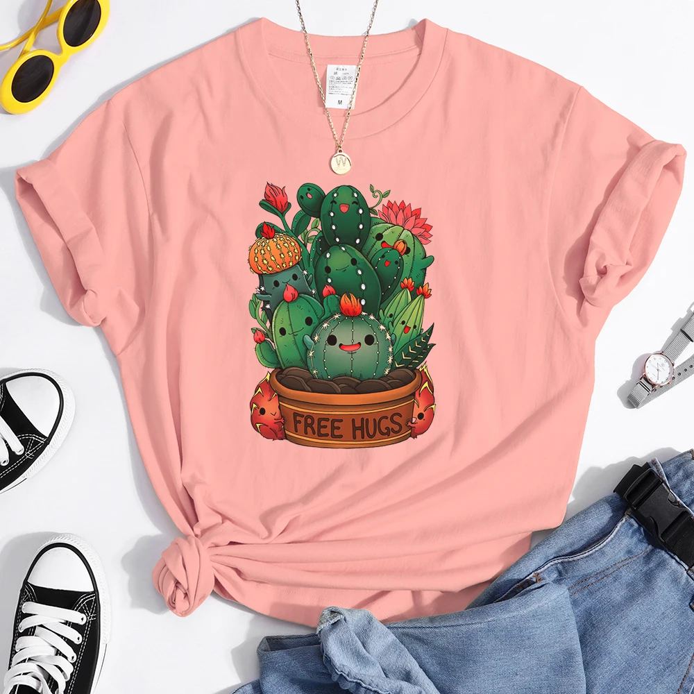 Милые растения, кактус, бесплатные объятия, забавные женские футболки с принтом в стиле каваи, топы в мультяшном стиле, футболки большого размера, летняя свободная женская футболка