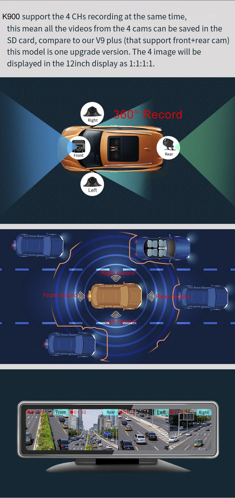 Автомобильный видеорегистратор, 12 дюймов, 4 камеры, видеорегистрат...