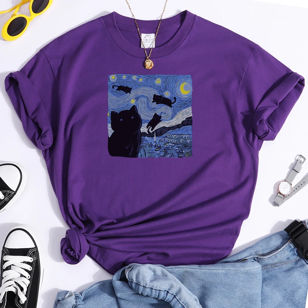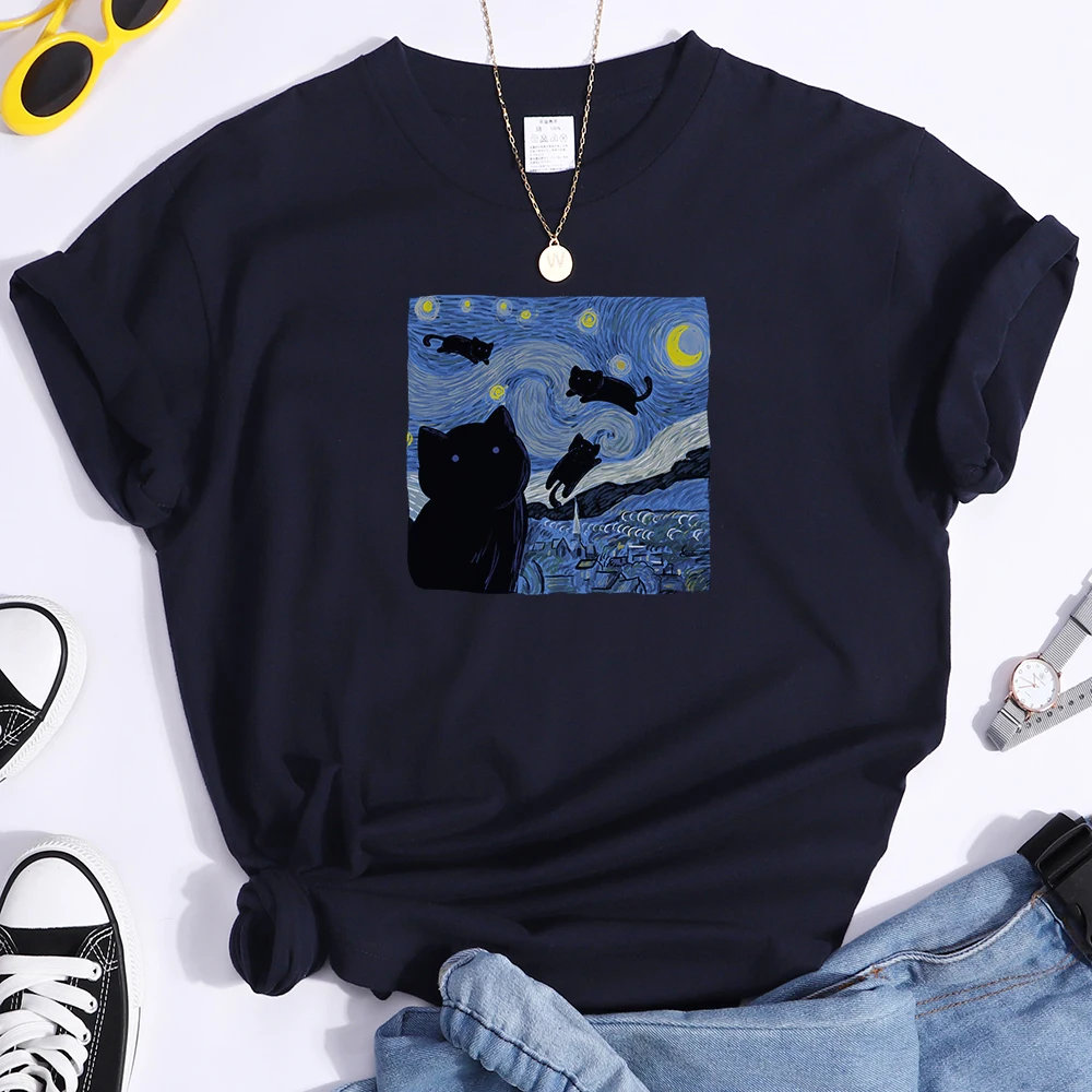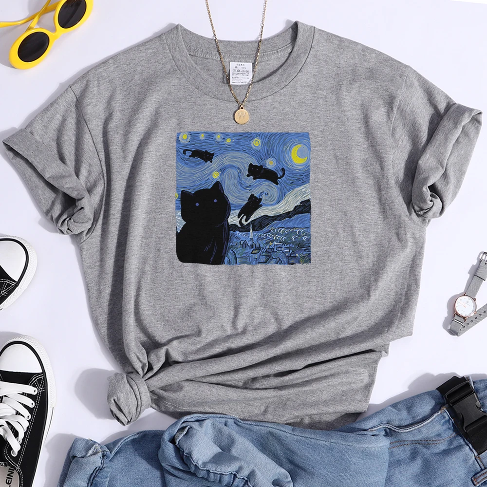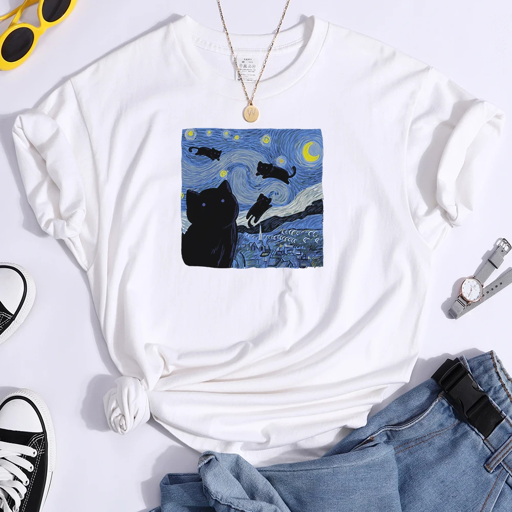 Женская футболка с принтом Винсента Ван Гога «Звездная ночь», с изображением милого кота в живописи, мягкие Топы в стиле хип-хоп, свободная футболка, летние женские футболки