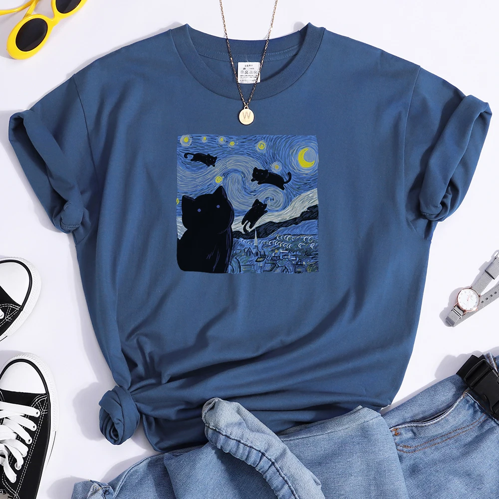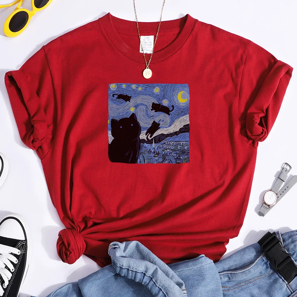 Футболка женская с принтом Винсента Ван Гога, Мягкий Топ свободного покроя, с изображением звездной ночи, кошки в стиле хип-хоп, лето