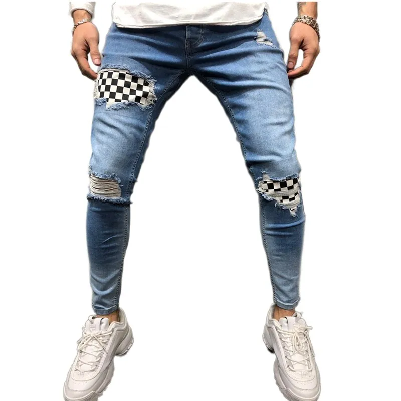 Лидер продаж, рваные джинсовые брюки со сращением, джинсы-карандаш, модные мужские джинсы, облегающие брюки с нашивками, брюки для отдыха с эластичной талией в клетку