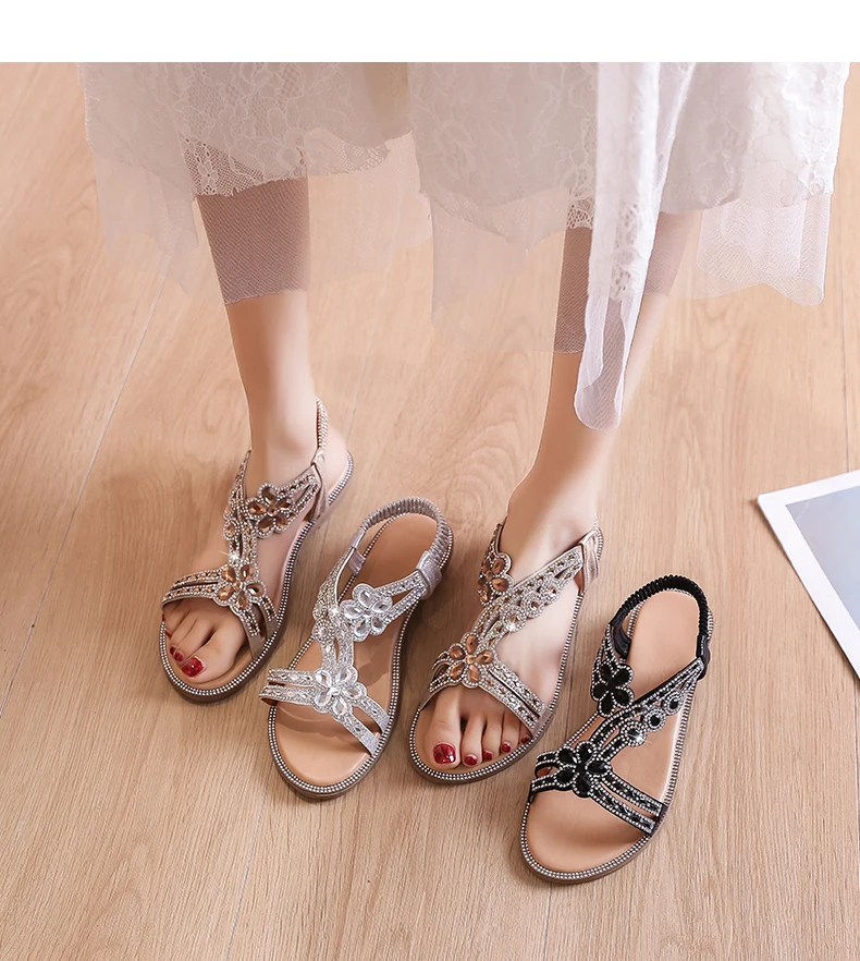 2021 женские туфли на плоской подошве, летние роскошные дизайнерские сандалии стразы, элегантные блестящие пляжные сандалии с бриллиантами, черные, серебристые, золотистые сандалии