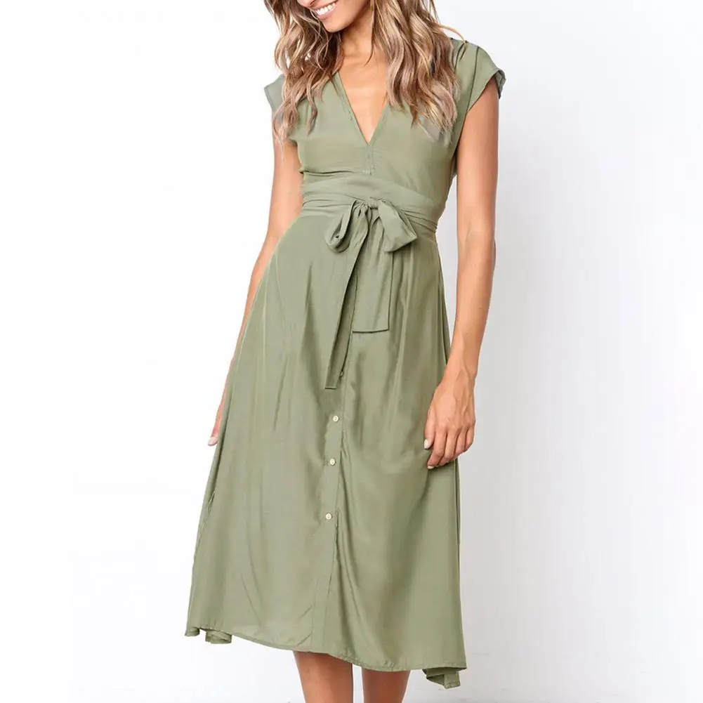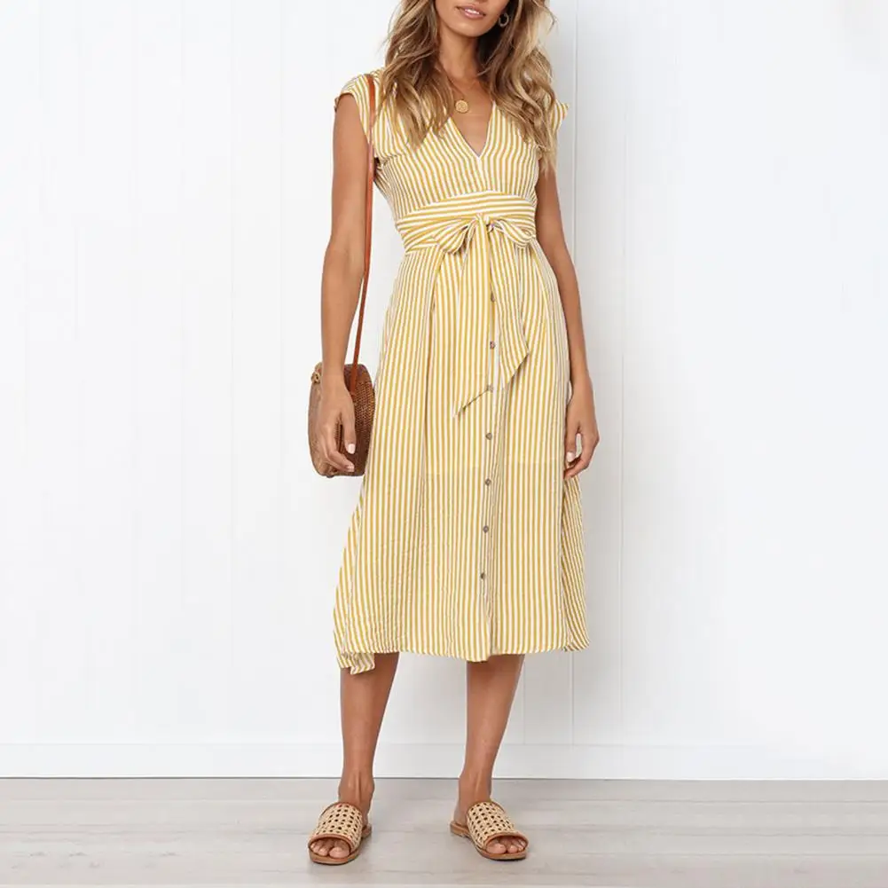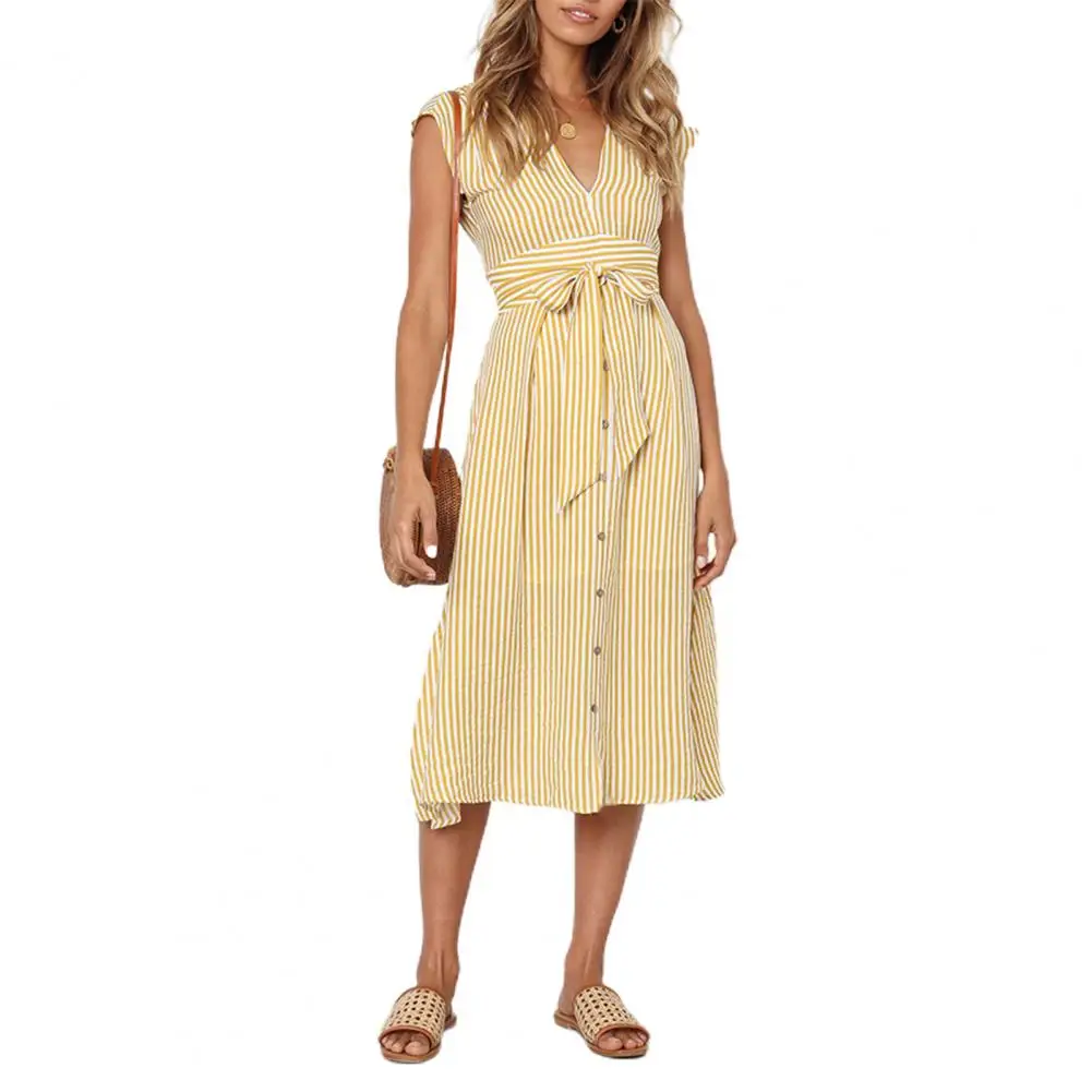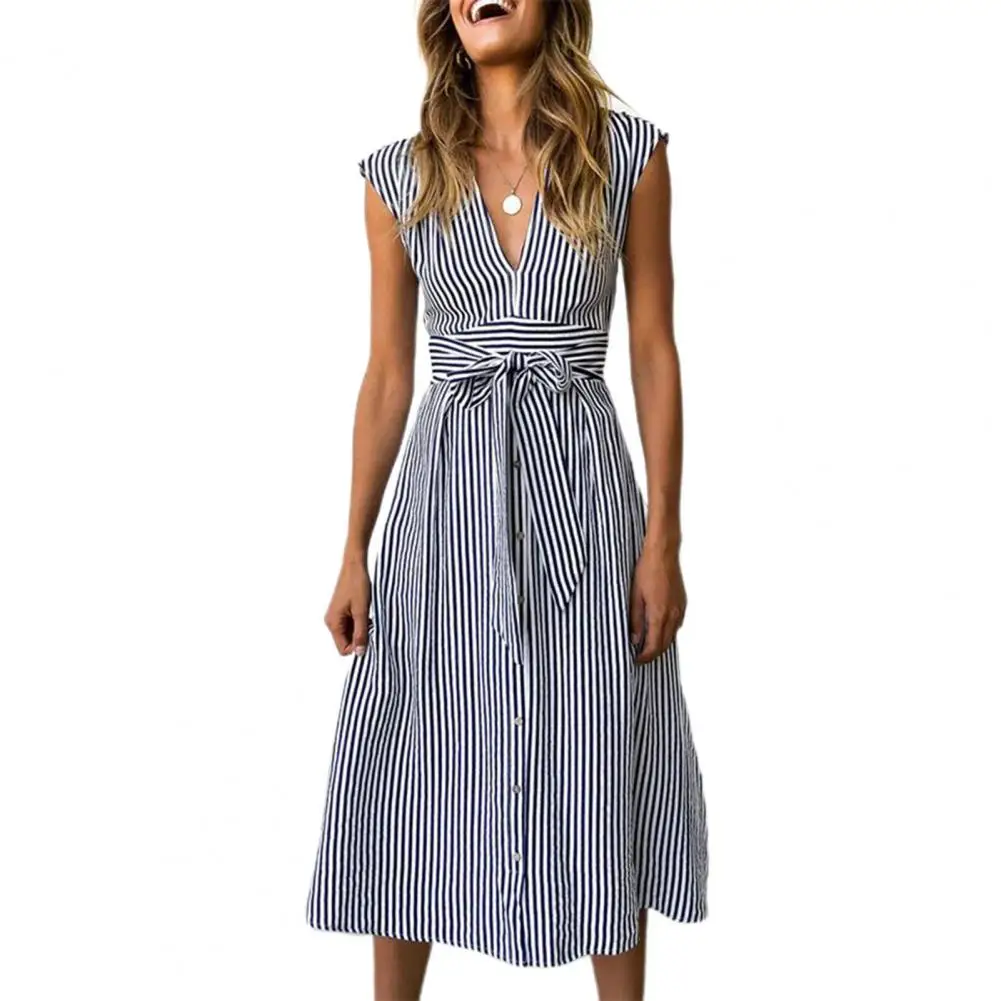 Женское платье в полоску с завязкой на талии, летняя юбка с V-образным вырезом и пуговицами для свиданий