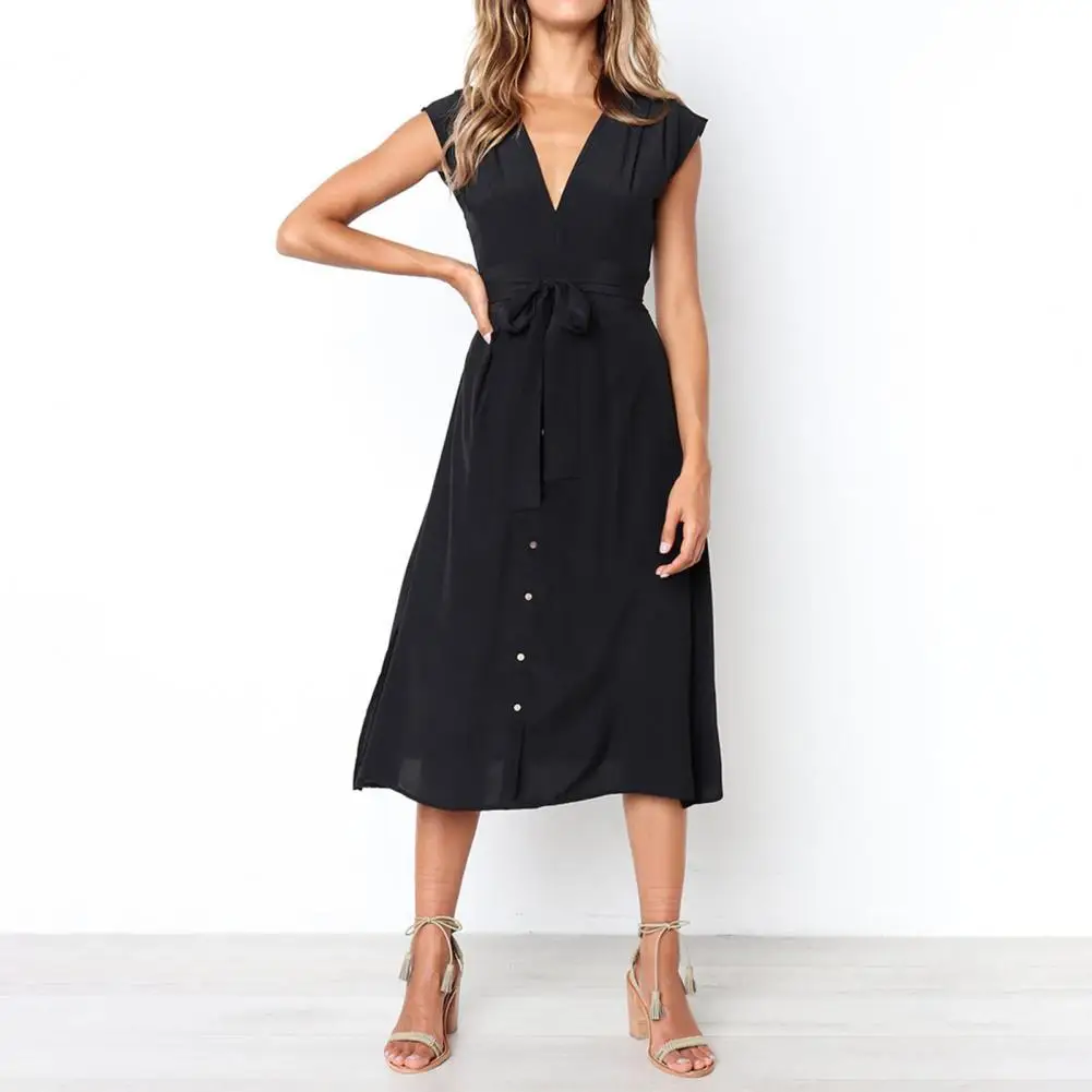 Платье женское с глубоким V-образным вырезом, элегантный длинный сарафан в полоску, с завязкой на талии, на пуговицах, повседневный элегантный, на лето