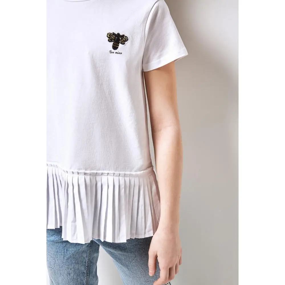 Белая футболка прямого кроя с небольшим декором в виде пчёлки и плиссированным низом сшита из сшита из натурального, гипоаллергенного, приятного к телу и «дышащего» материала. Рост/размер одежды модели на фото: 140.