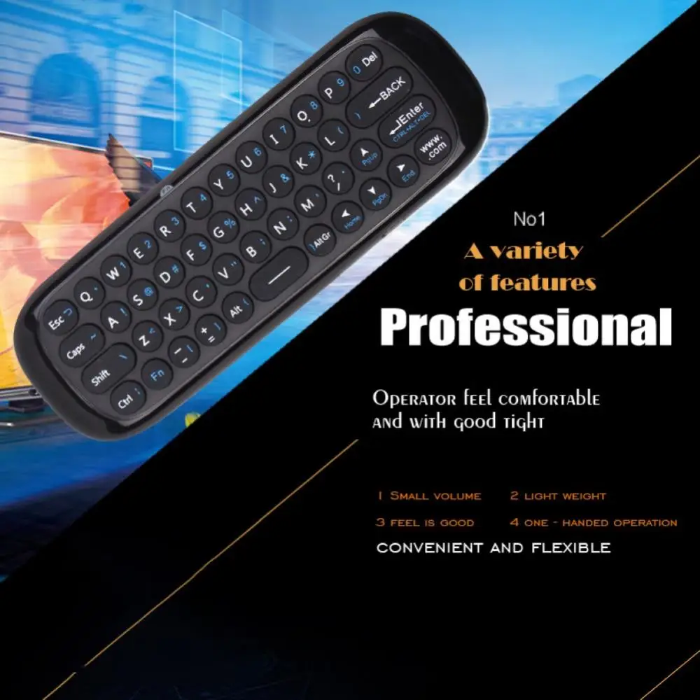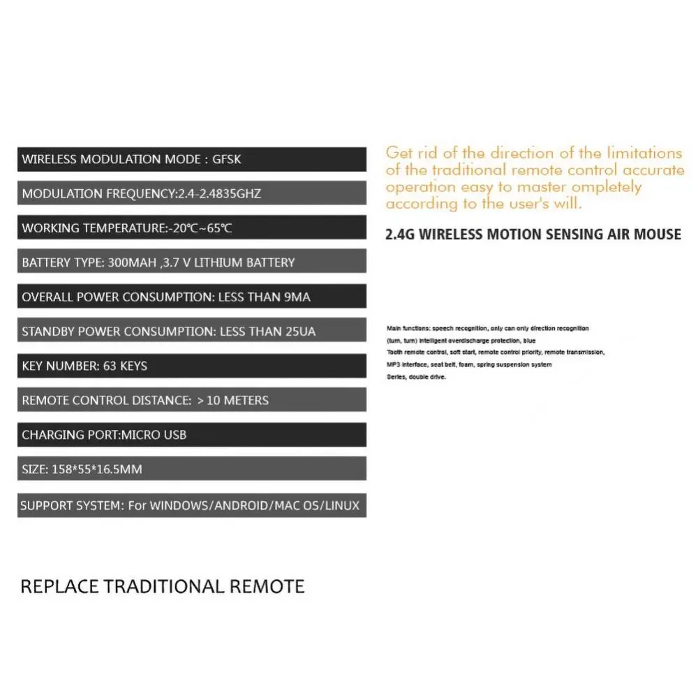 Двухсторонняя беспроводная мини-клавиатура 2,4 ГГц, ИК-пульт дистанционного управления с USB-приемником для Android TV Box компьютера Характеристики:Портативный и легкий, удобный для захвата.Беспроводная технология 2,4 ГГц, защита от помех.Поставляется с USB-приемником, подключи и работай, прост в эксплуатации.Подходит для smart TV, Android TV Box, ПК/HTPC, проекторов, компьютеров и т. д. Название товара: Беспроводная КлавиатураМатериал: АБСРежим беспроводной модуляции: GFSKМодулированная частота: 2,4-2,4835 ГГцРабочая температура: от-20 до 65 градусов ЦельсияТип аккумулятора: перезаряжаемый аккумулятор 3,7 в/300 мАч (входит в комплект)Общее потребление энергии: <15 мАПотребляемая мощность в режиме ожидания: 25 мкАКоличество ключей: 57 ключейРасстояние дистанционного управления: >10 метровПорт зарядки: Micro USBОсобенности: Беспроводной, пульт дистанционного управления, многофункциональныйРазмер: 15,8x5,5x1,65 см/6,22x2,17x0,65 дюйма (прибл.) Примечания:Из-за разницы в освещении и настройках экрана цвет изделия может немного отличаться от изображения.Возможны незначительные различия в размерах из-за различий в измерениях вручную. Посылка входит:1 беспроводная клавиатура1 х USB-приемник1 х зарядный кабель