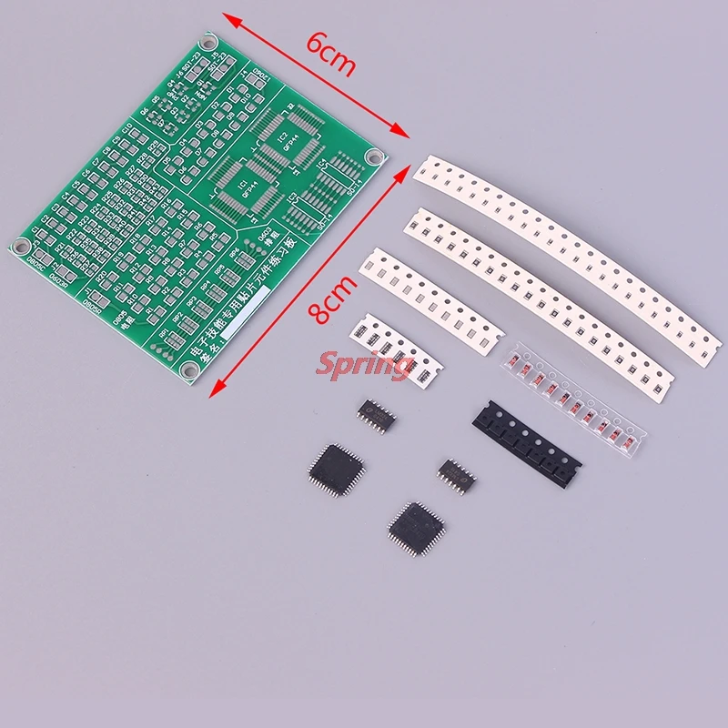 Толщина платы: 1,6 ммПодходящие сварочные компоненты SMD имеют 9 категорий, всего 110 шт. и устанавливают соответствующие тестовые точки.① Резистор --- 0805 (20 шт., все последовательно, общее сопротивление R1)② Резистор --- 0603 (34 шт., все последовательно, общее сопротивление R2)③ Резистор --- 0402 (10 шт., все последовательно, общее сопротивление R3)④ Сетевой резистор --- 0603 (6 шт., все последовательно, с тестовыми точками)⑤ Конденсатор --- 0805 (20 шт., все последовательно, общая емкость C1)⑥ Диод-3216 (10 шт., все последовательно, тестовая точка Da)⑦ Транзистор-SOT-23 (6 шт., с тестовыми точками)⑧ Встроенный чип SO-14 (2 шт., с тестовыми точками)✮Встроенный чип-LQFP44 (2 шт., с тестовыми точками)Посылка входит: 1 Набор печатной платы для практики