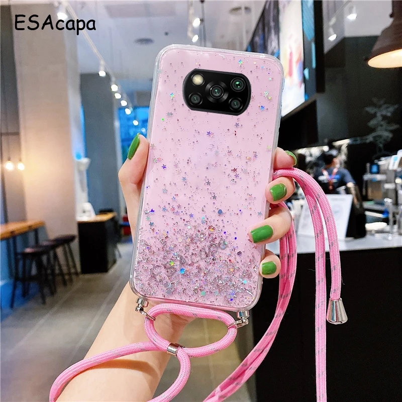 Чехол для Xiaomi POCO X3 Pro M3 F3, чехол с ремешком, шнуром, цепочкой, ремешком, чехол для POCO X3 NFC M 3 F 3, блестящий силиконовый чехол с блестками