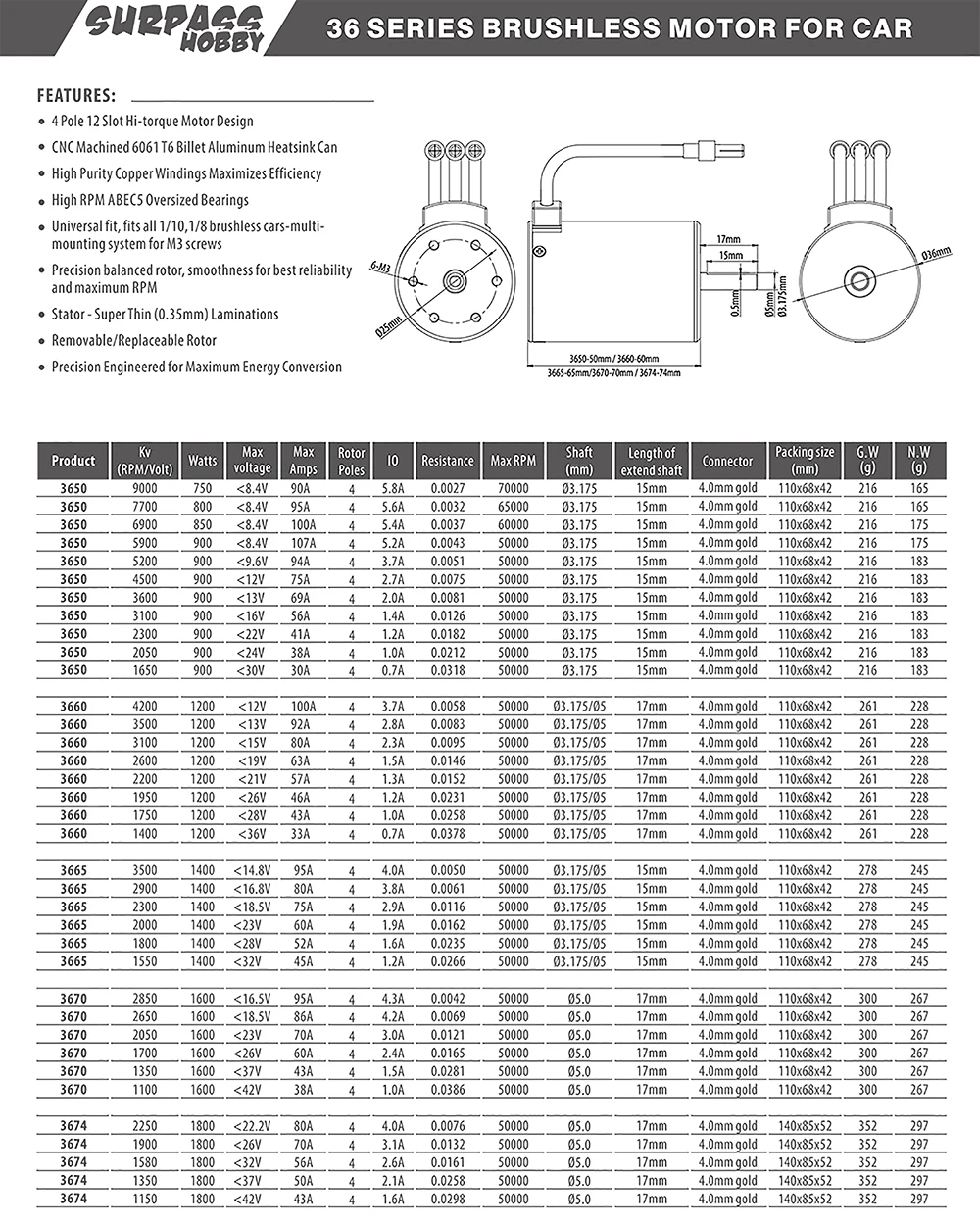 1,4 Полюс 12 слотов с высоким крутящим моментом дизайн двигателя.2. Высокое качество: CNC обработанный алюминиевые заготовки 6061 T6 радиатор, высокая чистота медных обмоток максимизирует эффективность, высокая RPM ABEC5 негабаритные подшипники.3. Универсальный, подходит для всех 2S 1:8,1/10 автомобилей, 3S, 4S 1:8 гоночных и внедорожных автомобилей.4. Прецизионный сбалансированный ротор, гладкость для лучшей надежности и максимальных оборотов в минуту.5. Статор-супертонкие (0,35 мм) пластин.Описание:1. Этот профессиональный бесщеточный мотор SURPASSHOBBY 3670 серии поставляется с высоким качеством. Универсальный подходит для 2s 1:10 RC автомобиля, 3s RC гоночного внедорожного автомобиля.2. Съемный/сменный ротор, точность спроектирована для максимального преобразования энергии.