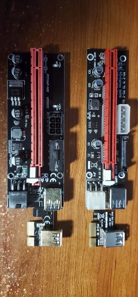 Эти стояки были великолепны до сих пор без проблем. Usb-соединения очень плотно прилегают, поэтому нет никаких шансов, что они случайно отключены. На них есть 2 фонаря для 12 В и 3,3 В, которые на картинке выглядят слепыми, но на человека они совсем не плохо. Они немного шире, чем предыдущий Ubit risers (на фото с новым), но это не должно быть проблемой, просто что-то, чтобы принять во внимание, если вы используете стойки на подъеме вы заменяете. Мне нравится прямоугольный 4-контактный molex, который есть, и есть также два 6-контактных разъема pci-e, в зависимости от того, что будет легче в вашей установке. Я бы рекомендовал оставаться вдали от питания sata к адаптеру pci-e 6 контактов, так как разъемы питания sata хороши только для ватт ~ 54 Вт, а переходник может использоваться до 75 ватт. Кажется, они очень прочные. Я бы не раздумывал рекомендовать их всем, кто ищет качественный продукт.