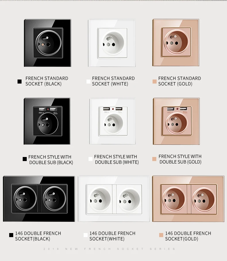 1. С 1 или двойным французским модулем гнезда 2. Номинальное напряжение (ы): 100 ~ 250 В переменного тока/50 ~ 60 Гц 3. Номинальный ток: 16A 4. Обеспечение заземления: с заземлением 5. Степень защиты от электрического удара: с повышенной защитой 6. Тип клемм: встроенный тип винтов 7. Размер: 86 мм x 86 мм 8. Цвет: белый/черный/шампанское золото 9. Материал панели: закаленное Хрустальное стекло/Огнестойкий Поликарбонат пластик 10. Стандарт гнезда: Европейский или французский стандарт Schuko