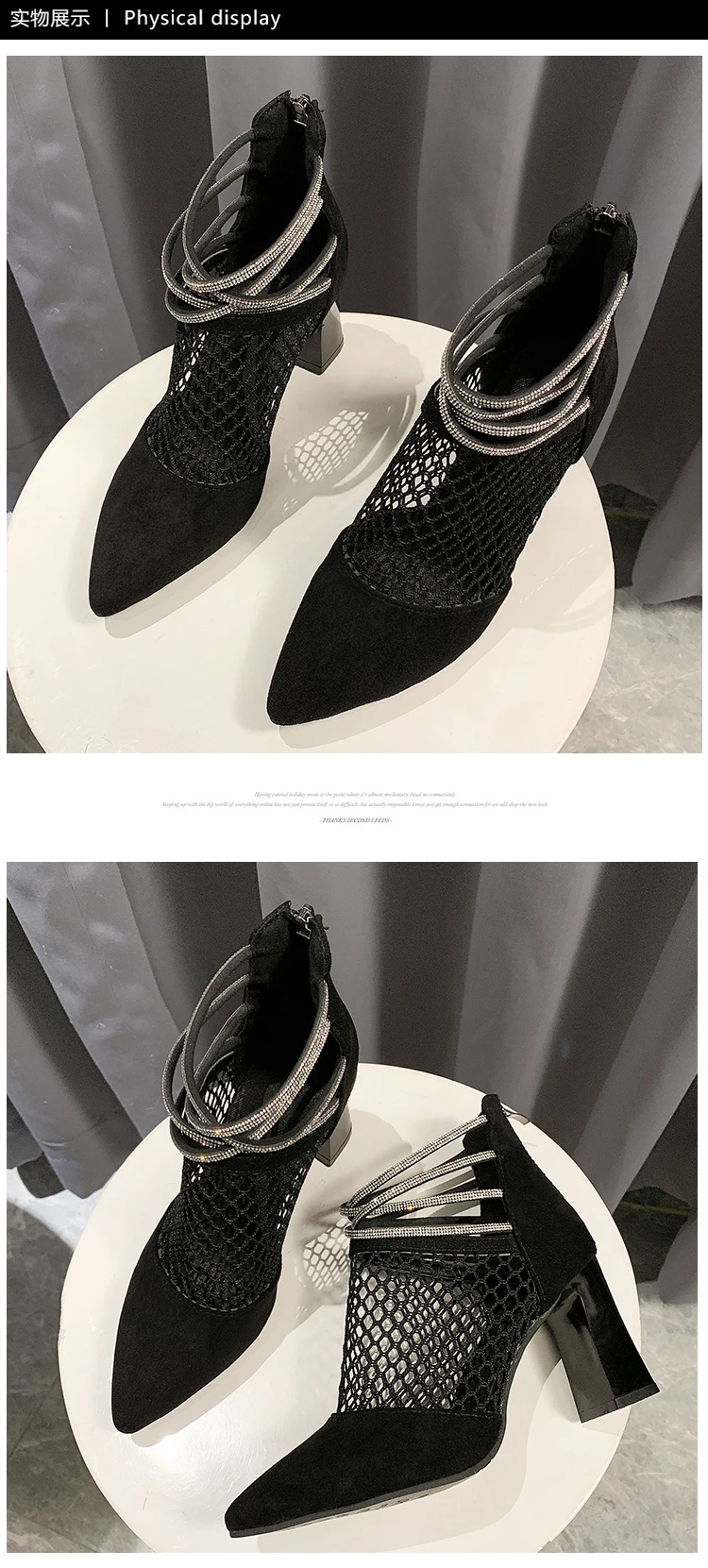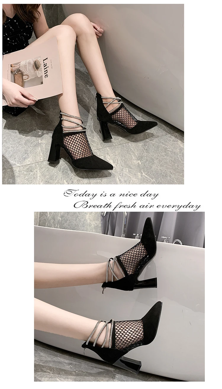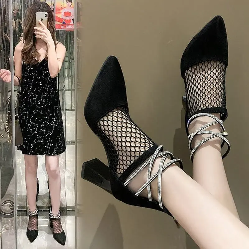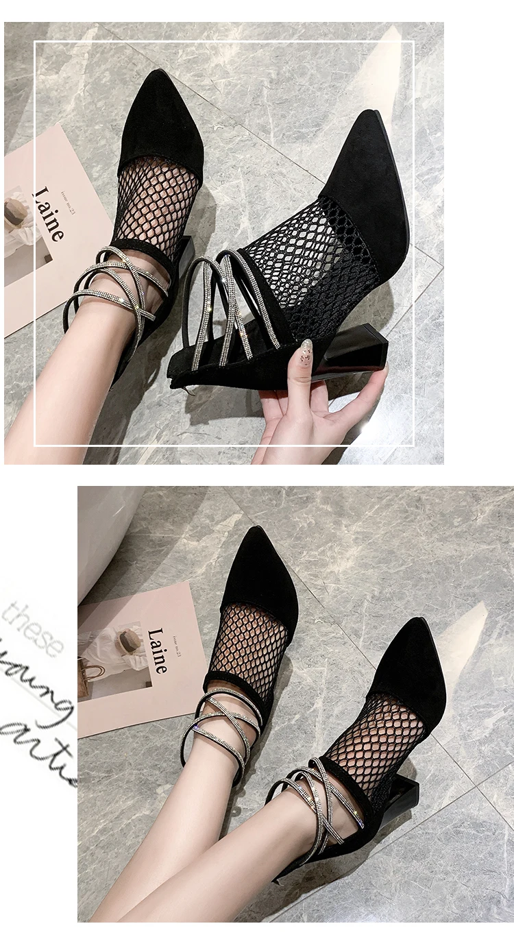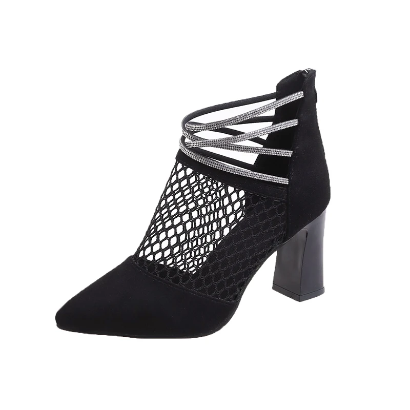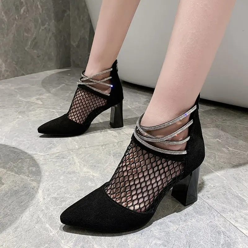 Женские Классические сетчатые сапоги, черные дышащие вечерние сапоги на высоком квадратном каблуке с кристаллами, лето 2021