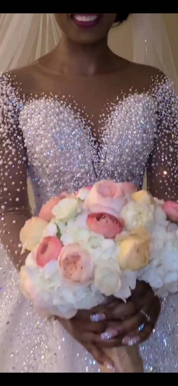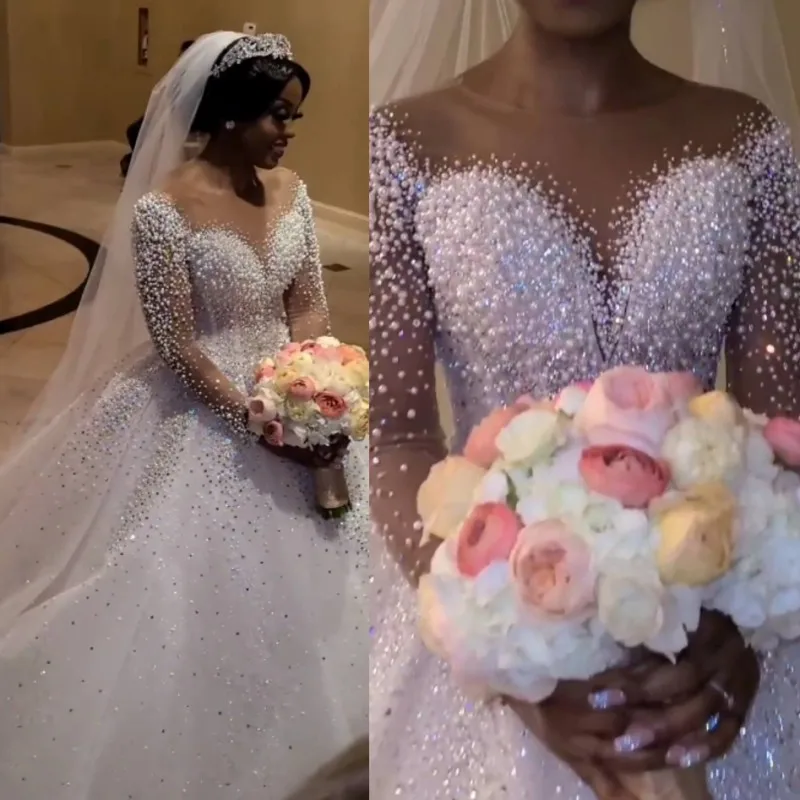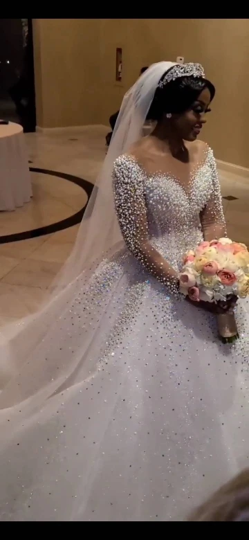 Блестящее свадебное платье с длинными рукавами, аппликацией из бисера