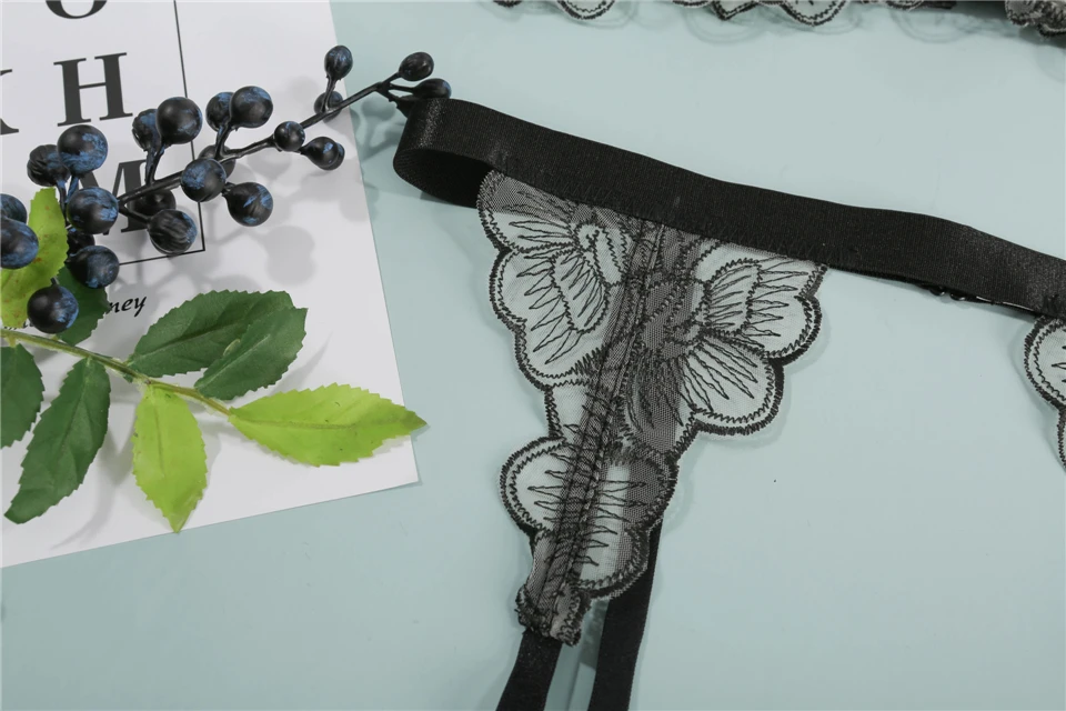 Комплект эротического нижнего белья с вышивкой, прозрачный кружевной бюстгальтер с чашками пуш-ап, подвязки, стринги, 3 предмета
