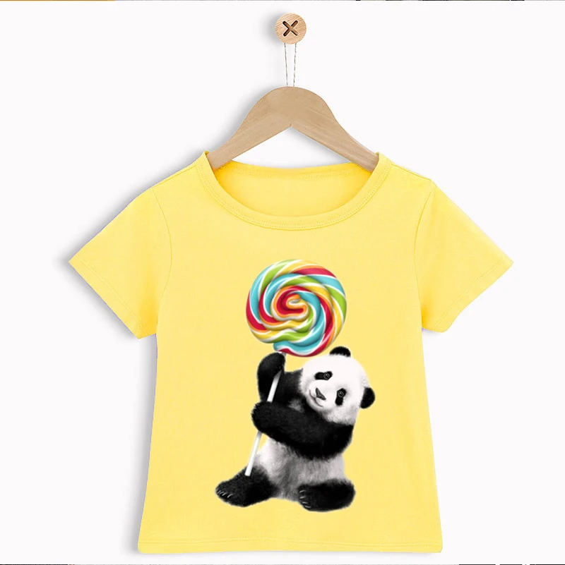 Новинка, футболка для мальчиков, Забавная детская одежда с графическим принтом панды ест леденец, летняя рубашка для малышей, милые желтые Топы с коротким рукавом