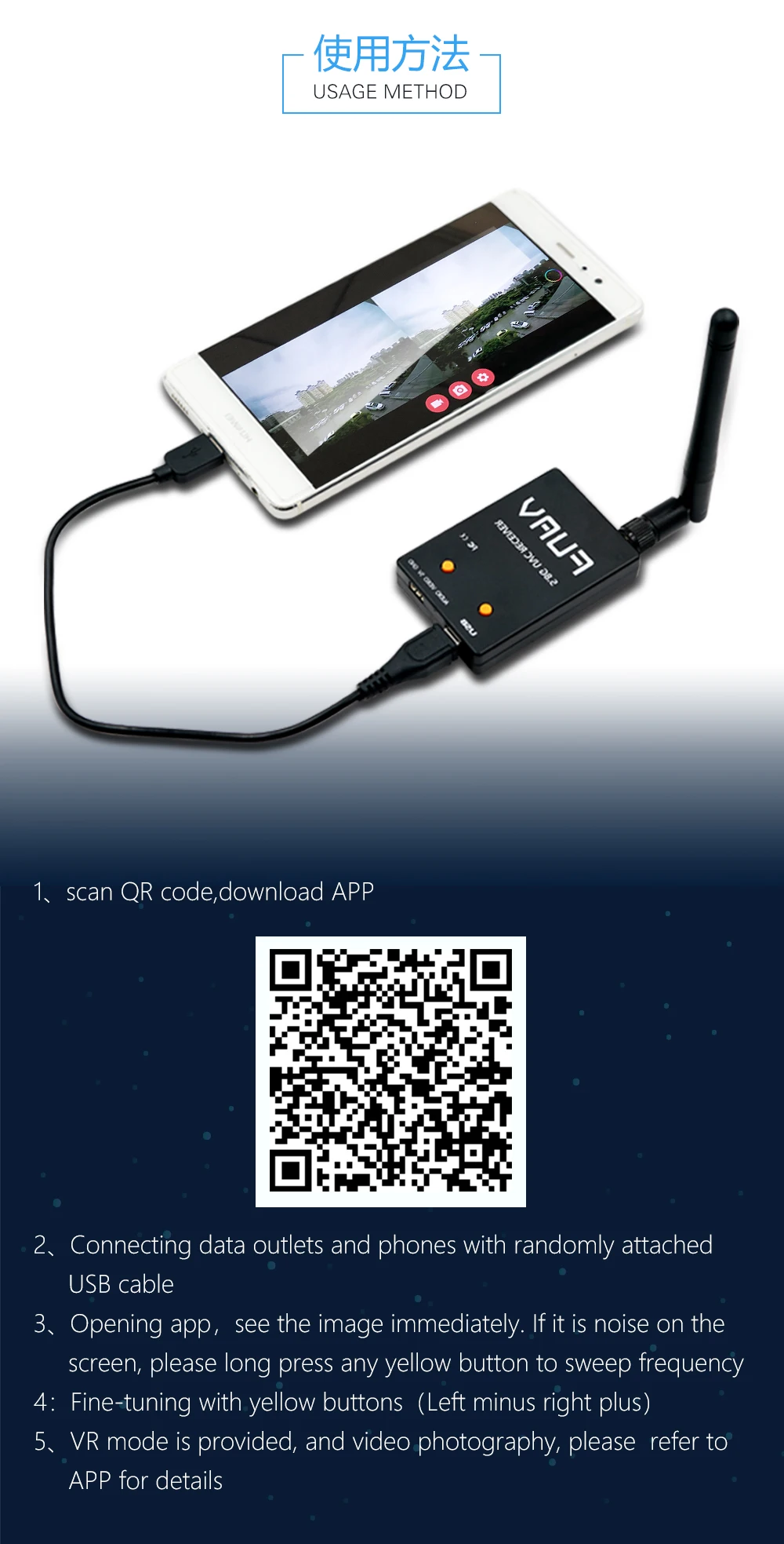 1. Поддержка кабеля OTG для подключения к смартфону или планшету android.2. Приемник FPV с одной антенной для монитора планшетного ПК Android.