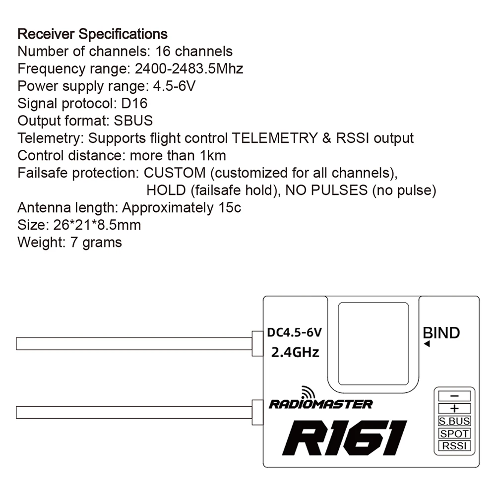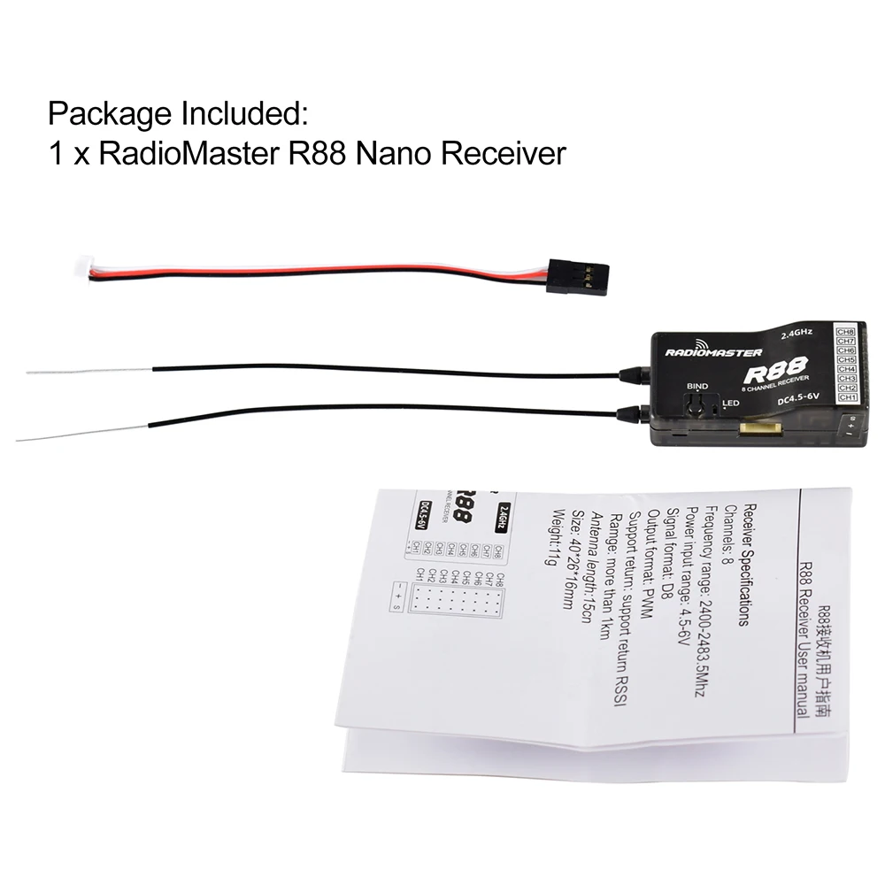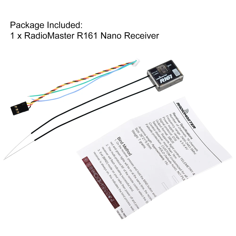 Радиомастер R81 R84 R86 R86C R88 R161 R168Нано-приемник 2,4 ГГц с частотой свыше 1 км, совместимый с передатчиком FrSky D8 TX16S, диапазон частот 2400-2483,5 МГц, поддержка возврата RSSI для дрона RC.Характеристики:Бренд: RadioMasterНазвание товара: нано-приемник
