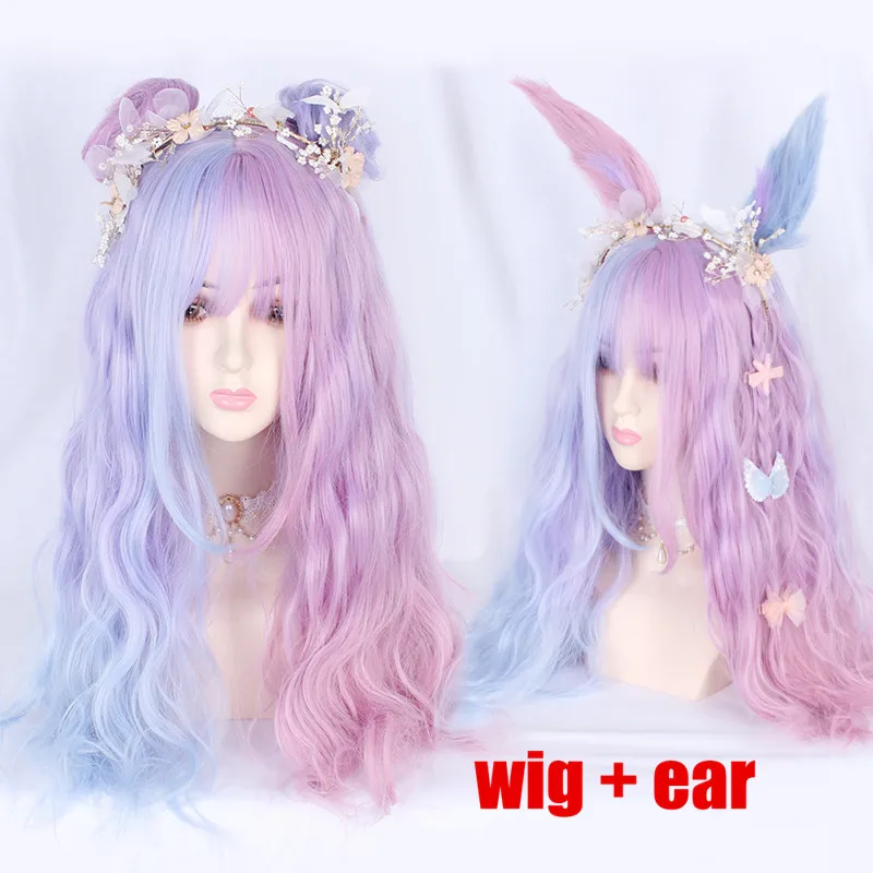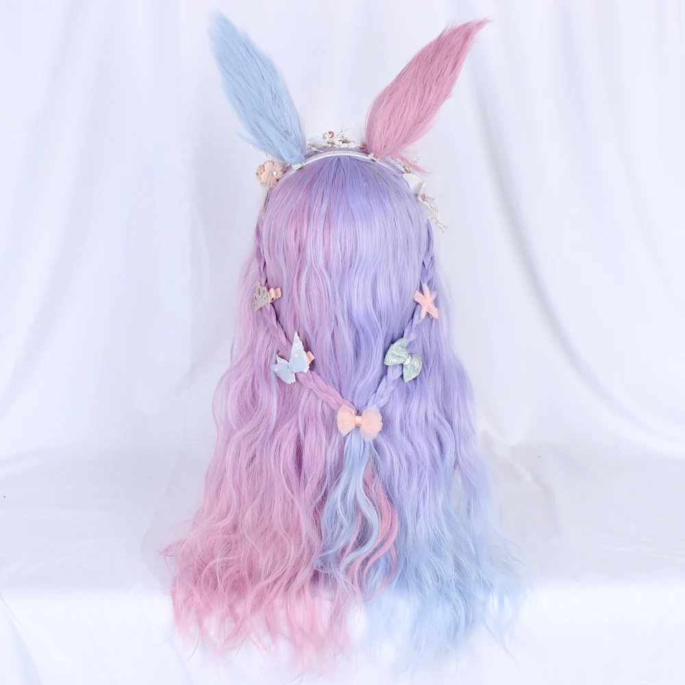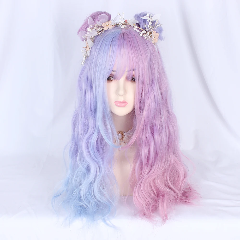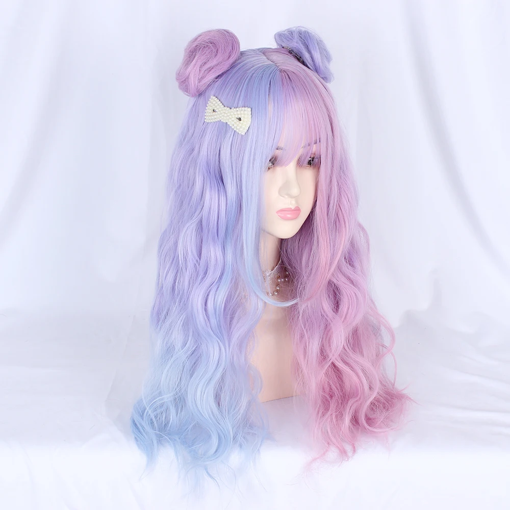 2021 Косплей микс Лолита 65 см длинные вьющиеся фиолетовые Смешанные голубые челки омбре с булочкой головная повязка японская Милая Женская Косплей синтетический парик