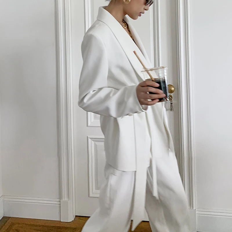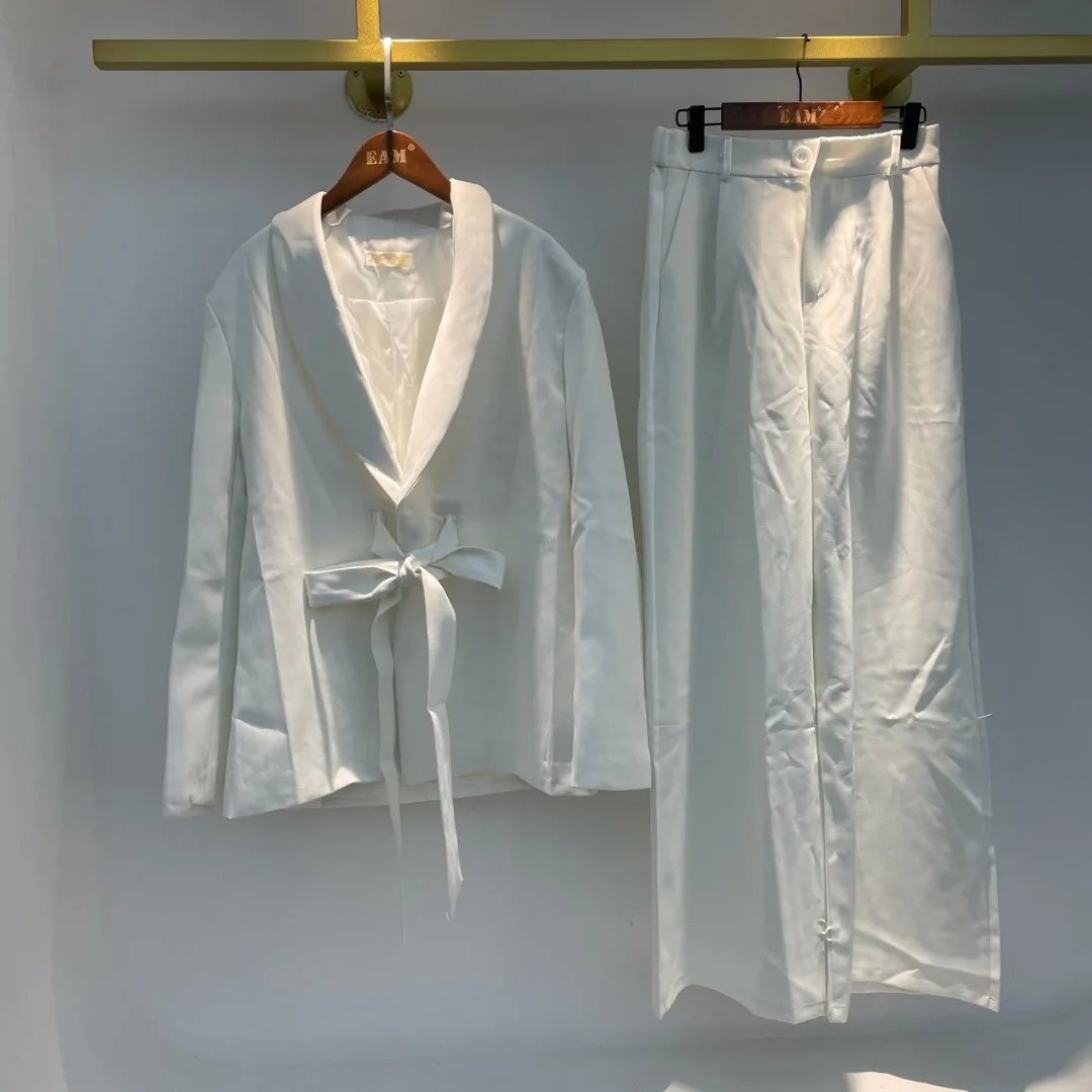 Женский повседневный комплект EWQ, комплект свободного кроя с высокой талией и регулируемыми штанинами, воротником с лацканами и длинным рукавом, блейзер с поясом