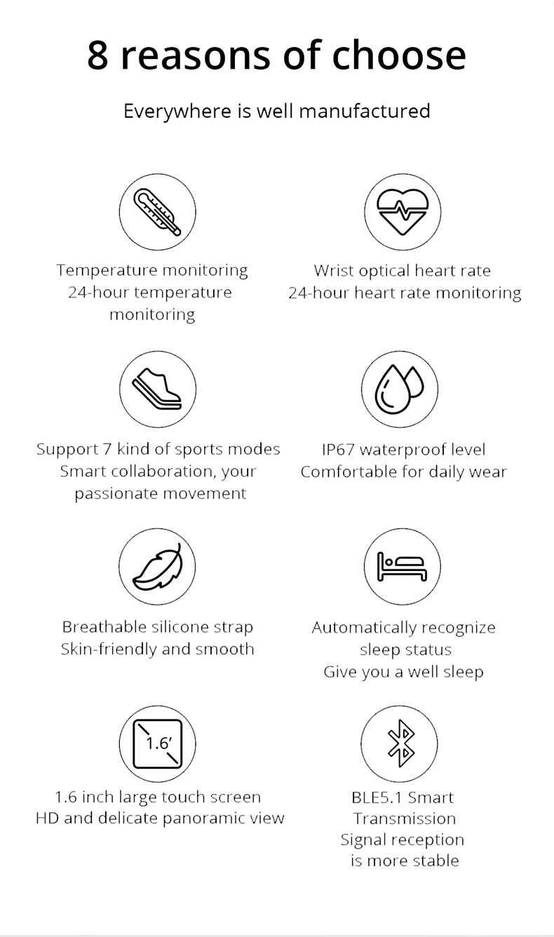 1. Мы отправим товар в течение 24 часов после подтверждения оплаты в рабочие дни (48 часов в выходные дни).2. Не используйте зарядное устройство выше 5 в/1 а.3. Данные не могут использоваться в качестве медицинской справки.4. Сообщите мне ваш текущий адрес в течение 1 дня после оплаты, в противном случае мы отправим товар по вашему адресу. Пожалуйста, убедитесь, что это правильно.5. Как правило, время доставки составляет от 15 до 60 дней, и разные страны/регионы прибывают в разное время!6. Иногда это занимает больше времени из-за плохой погоды, которая будет тратить время на таможенное оформление. Поэтому, если вы не получили товар вовремя, пожалуйста, будьте терпеливы. Если вы все еще не получили товар в течение 60 дней, пожалуйста, свяжитесь с нами, и мы поможем вам отследить его.7. Ремешок является стандартным размером на рынке. Если вам это не подходит, пожалуйста, предоставьте свой размер запястья службе поддержки клиентов, проверьте его перед оплатой.