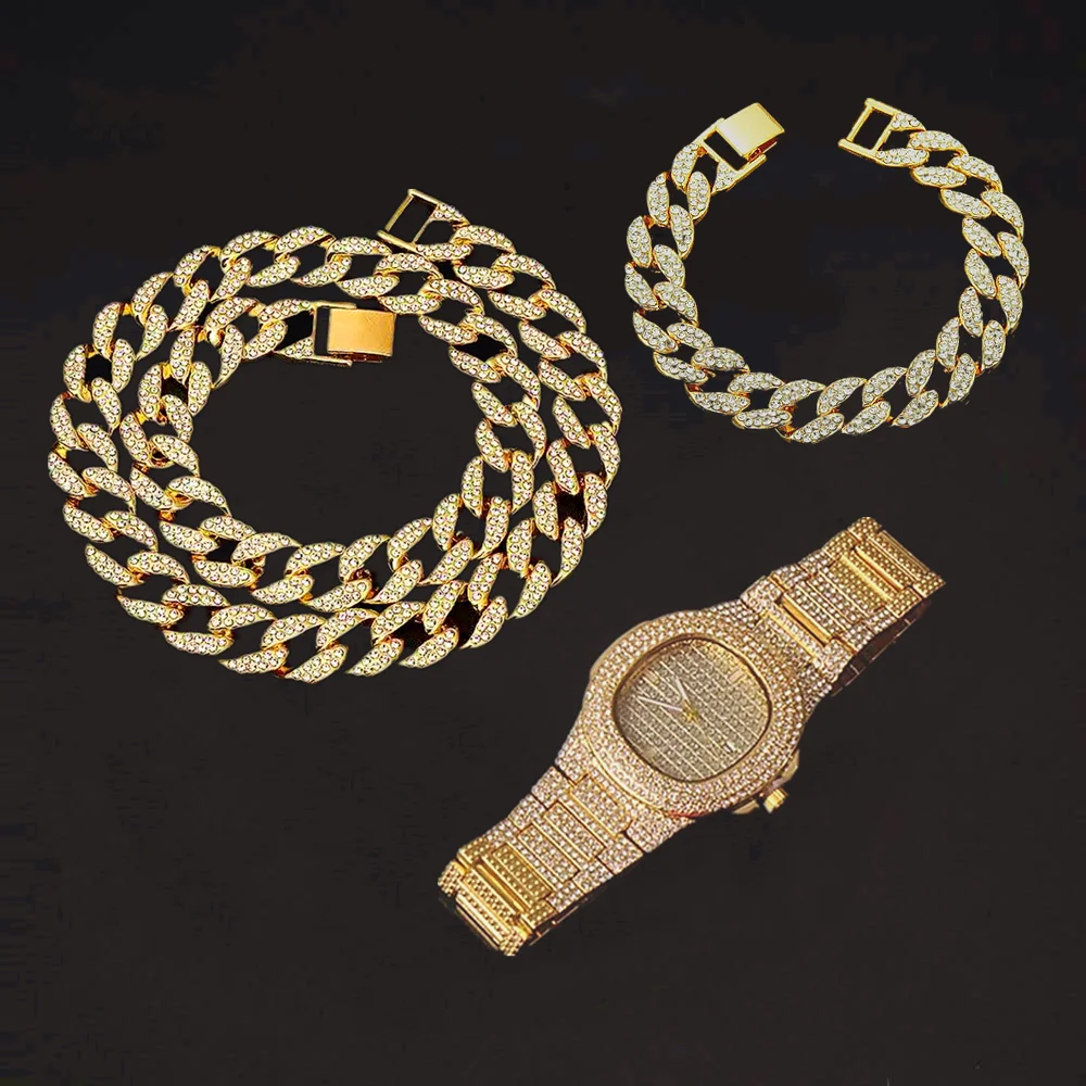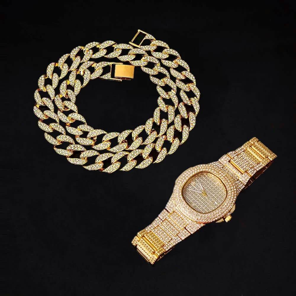 В стиле Рок, хип-хоп, Майами кубинской для мужчин колье льдом ограненные Стразы Bling цепи для комплект ювелирных изделий для мужчин часы ожерелий и браслетов