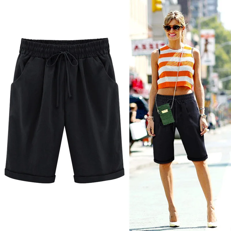 Женские однотонные шаровары с высокой талией, Капри, лето размера плюс, пляжные женские брюки, осенние черные повседневные свободные женские шорты