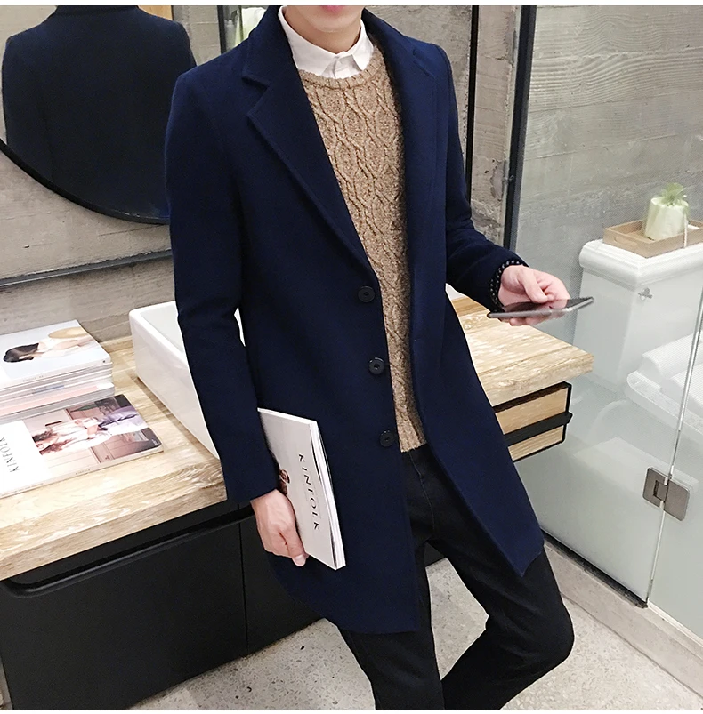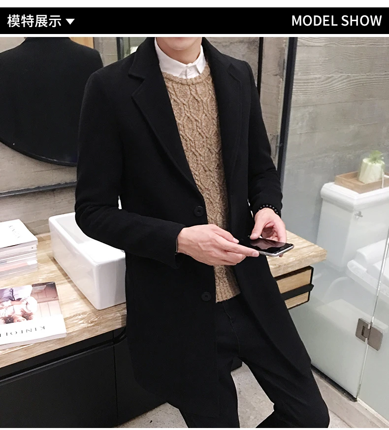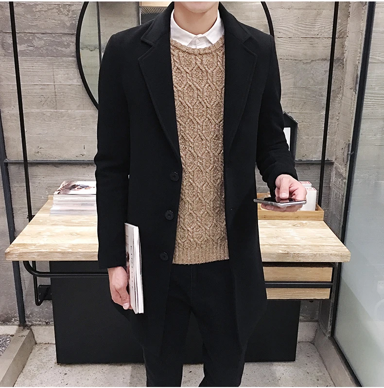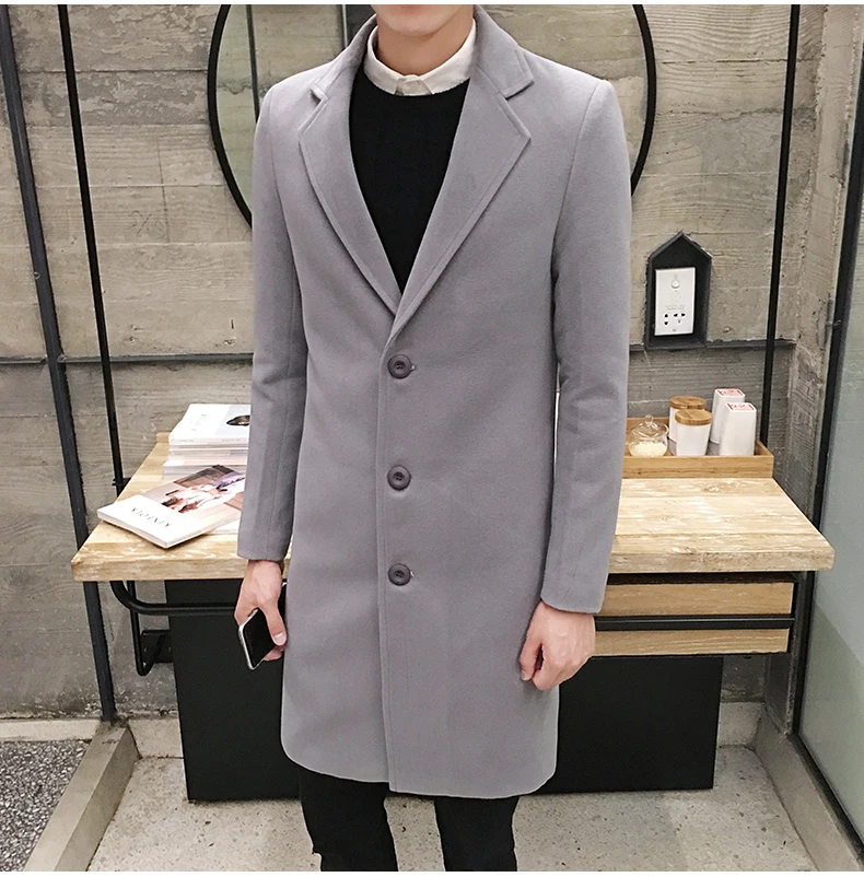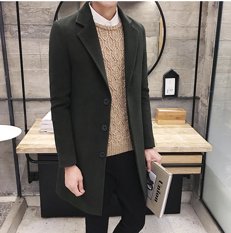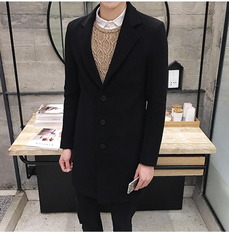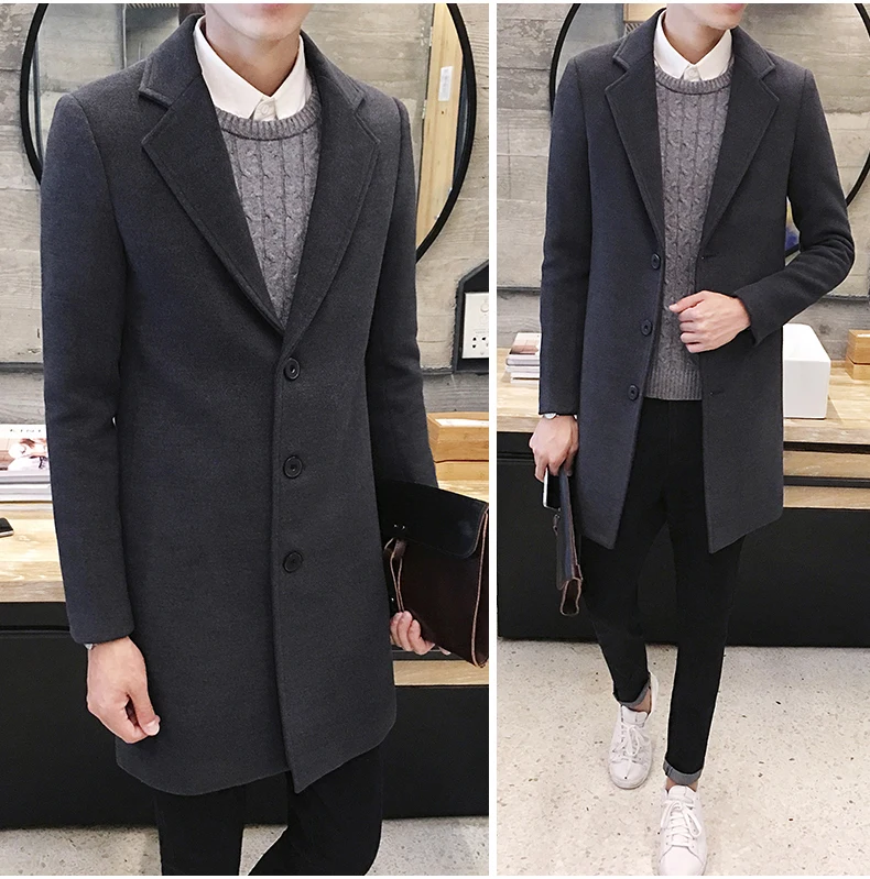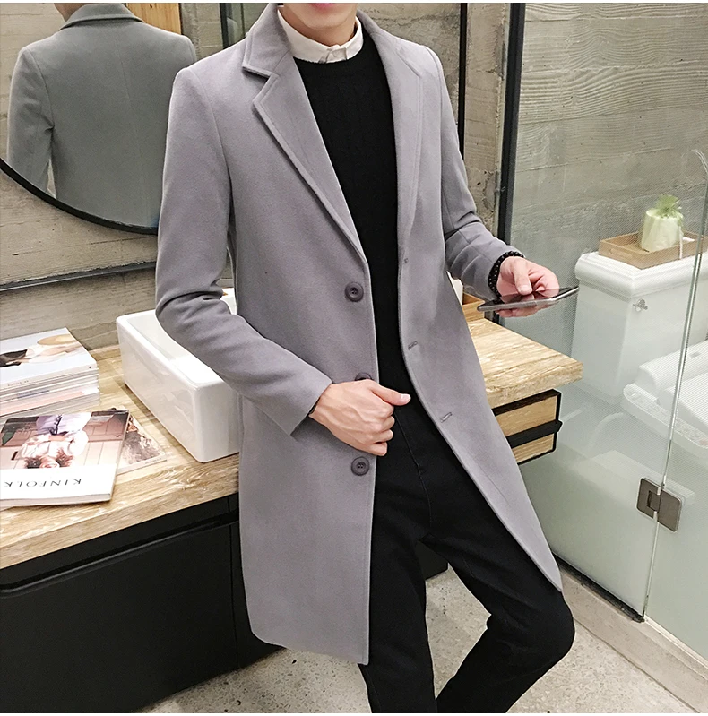 Мужское зимнее длинное шерстяное пальтомодное Однотонное шерстяное ...