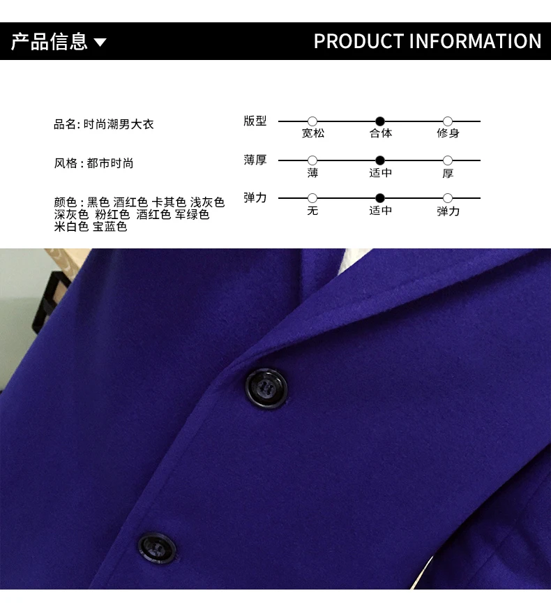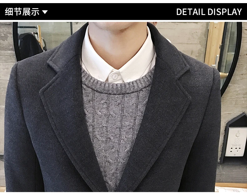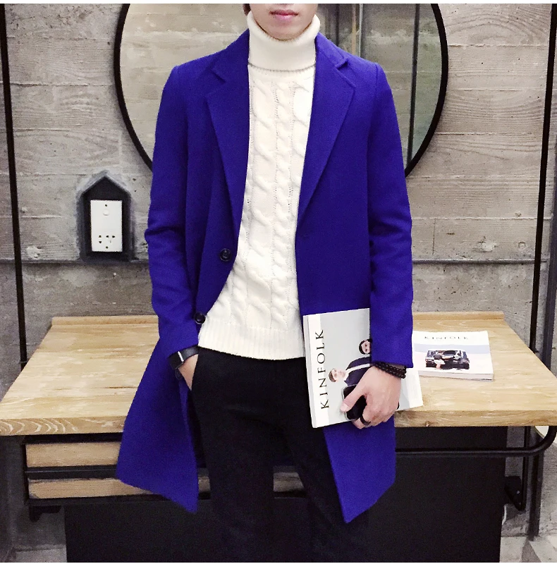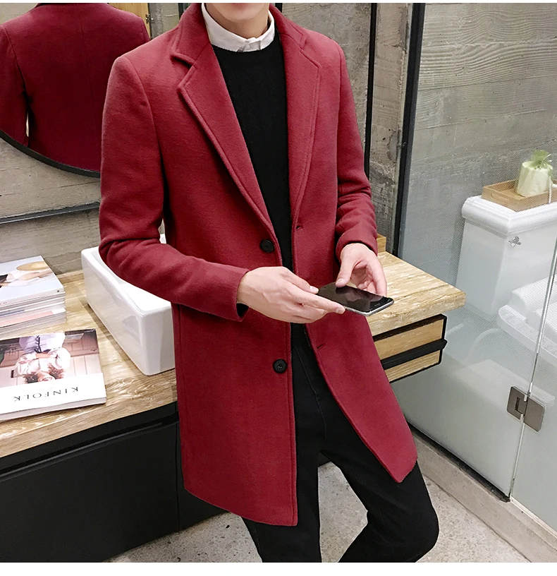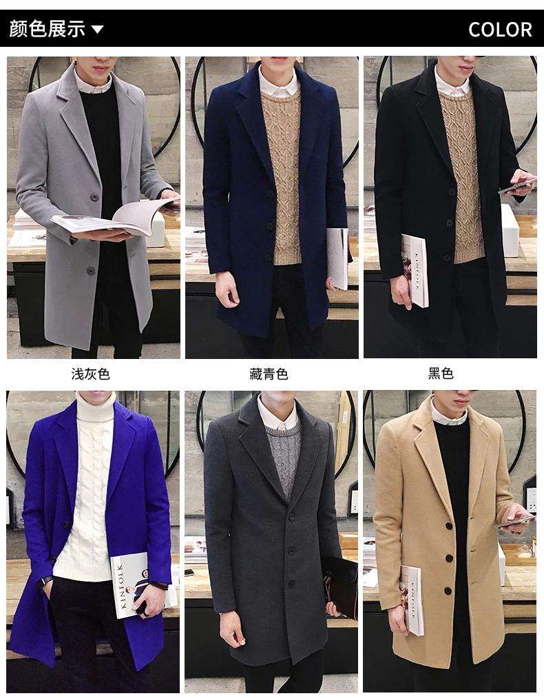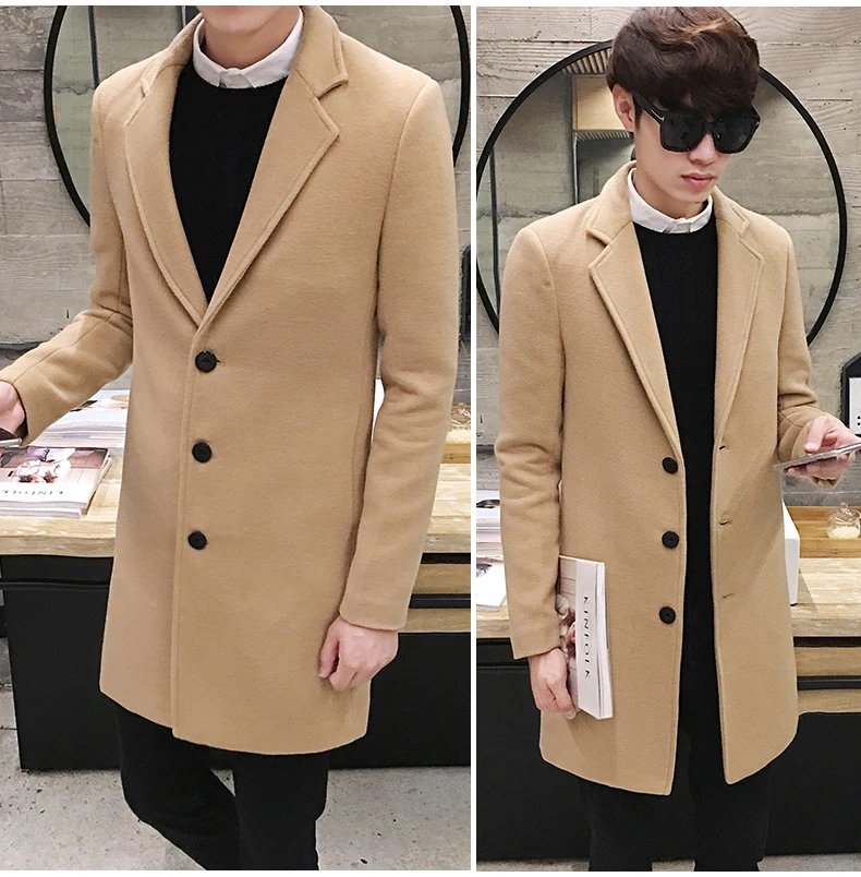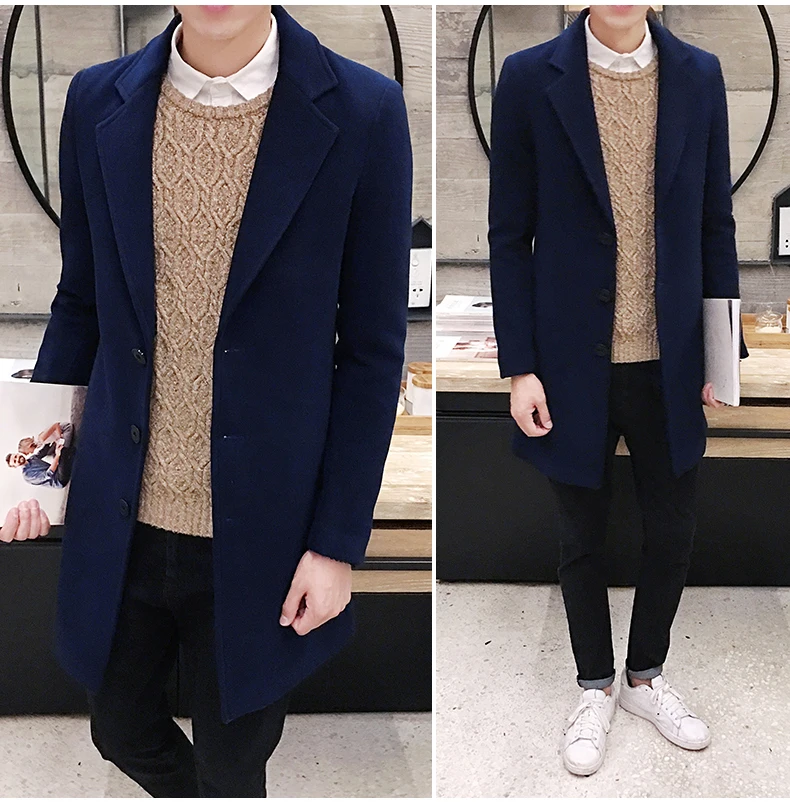 Мужское зимнее длинное шерстяное пальтомодное Однотонное шерстяное ...