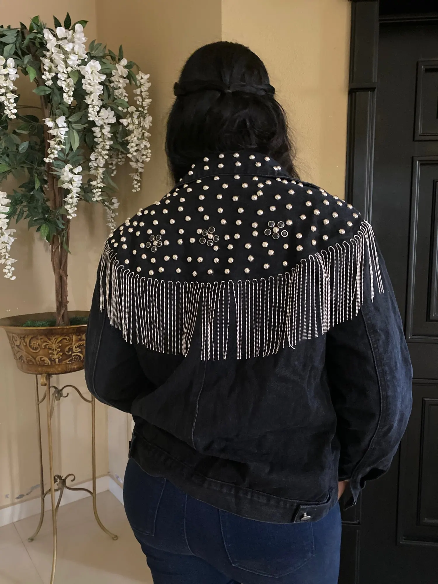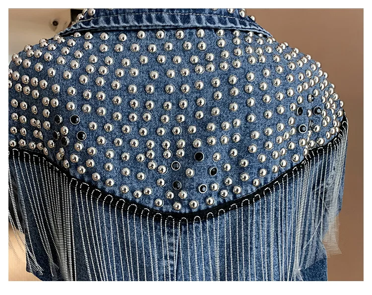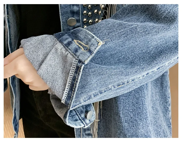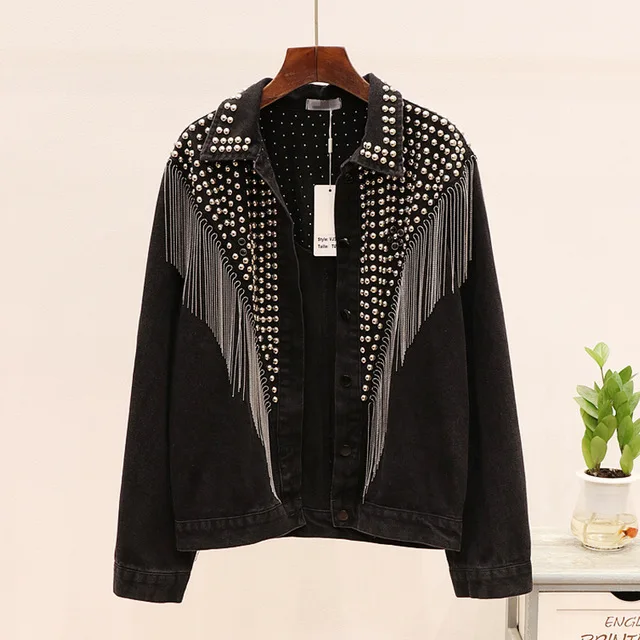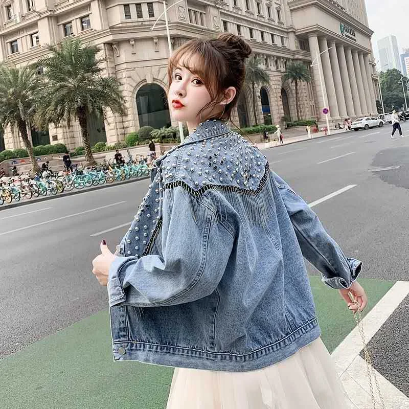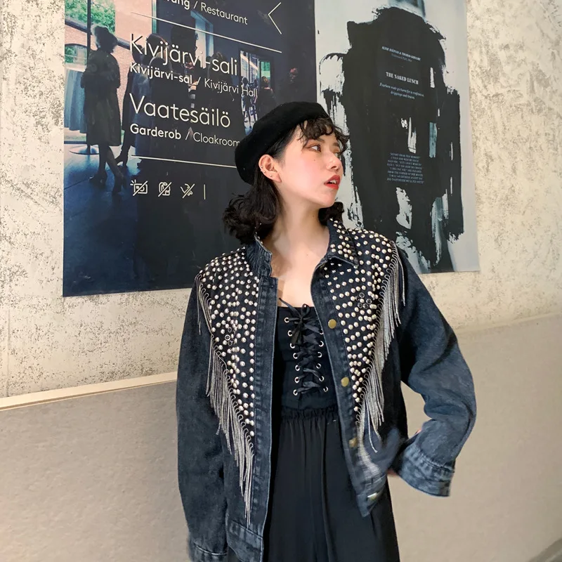 Женская джинсовая куртка, короткая черная куртка в уличном стиле, с заклепками и цепочкой, свободного кроя, осень 2020