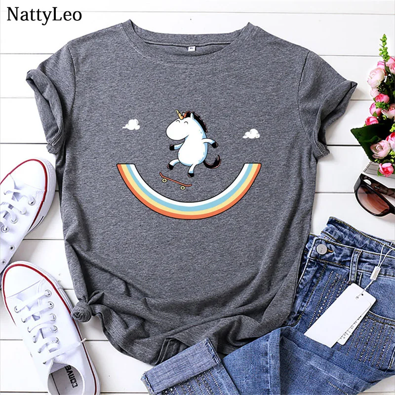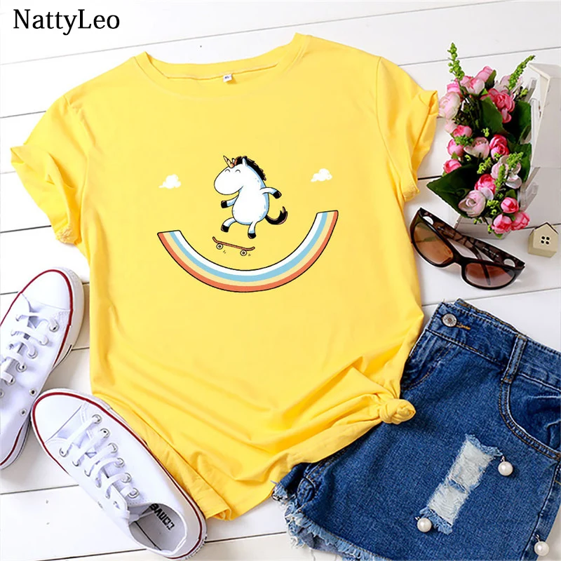 Летняя женская футболка размера плюс футболка смешной Единорог Футболка с принтом, топы с круглым вырезом и коротким рукавом, 100% хлопок для женщин футболки Kawaii одежда с открытыми плечами