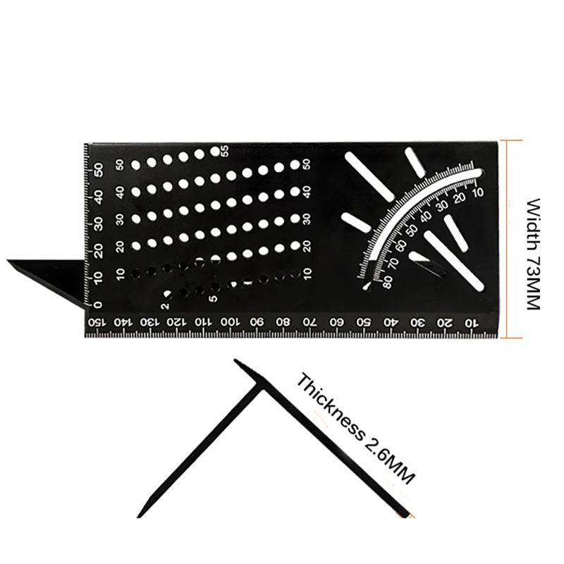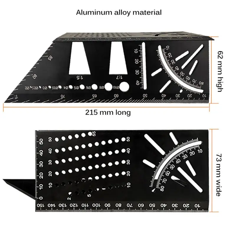 Описание: Алюминиевый сплав 3D мерный квадратный угол 45 90 градусов угловая линейка пунктуация маркировочный датчик Угол кадрирования транспортир деревообрабатывающий инструмент Спецификация: Материал: алюминиевый сплав Размер: 215x73x62мм Толщина: 2,6 мм Цвет: черный Вес: 130 г/4,59 унций Особенности: Четкая гравировальная Метрическая шкала, точная и легко читаемая. Для измерения размеров: брус, трубы и т. Д. Может использоваться в качестве маркировочного датчика для параллельных линий, измерения 45 и 90 градусов. Сверло для определения диаметра сверла. Поможет вам повысить эффективность работы и сэкономить время на деревообрабатывающих проектах. Он прост в использовании и может помочь вам закончить работу более эффективной и последовательной. Посылка включает в себя: 1 х угловая линейка
