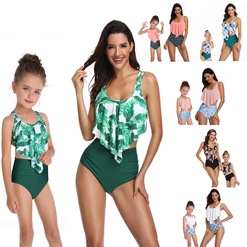 Новинка 2021, Раздельный купальник в европейском и американском стиле, женское бикини с высокой талией и принтом, купальник с воланами для родителей и детей