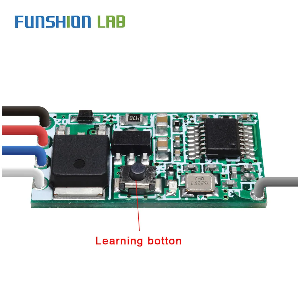 Нажмите кнопку обучения модуля 3 раза, светильник индикатора всегда включается, а затем нажмите кнопки на пульте дистанционного управления, светильник индикатора мерцает три раза, а затем выключается, затем обучение успешно; Если код не был успешным, Световой индикатор выходит из состояния исследования через 15 секунд.