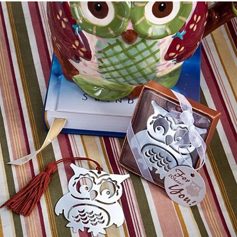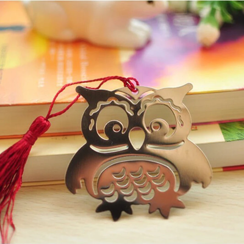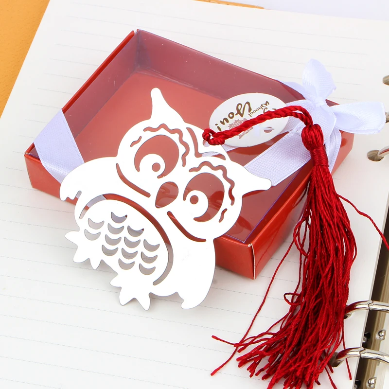 Бесплатная доставка, 10 шт.лот, креативные ажурные маркеры для книг в виде совы, металлические закладки из нержавеющей стали, свадебные подарки с кисточками