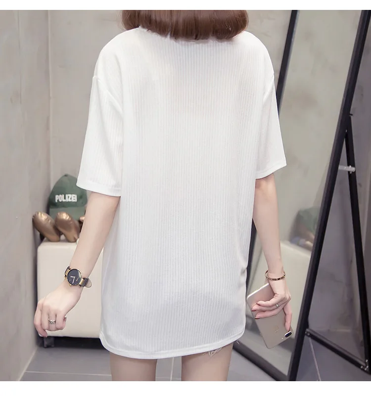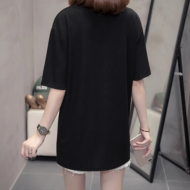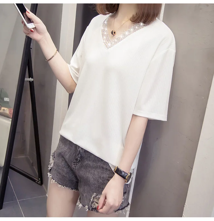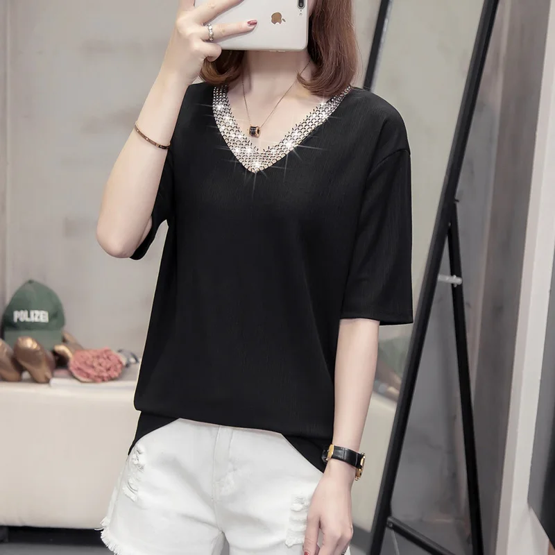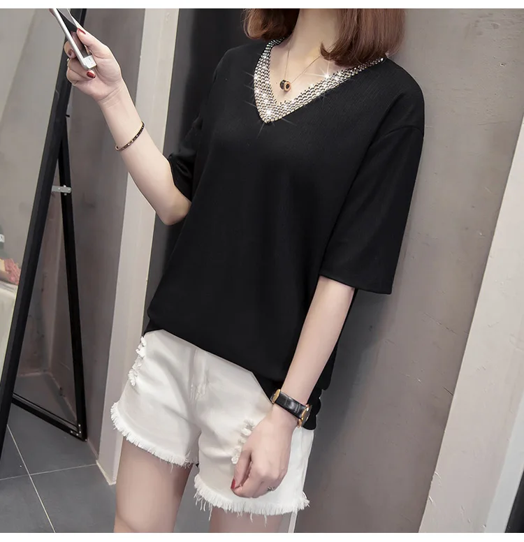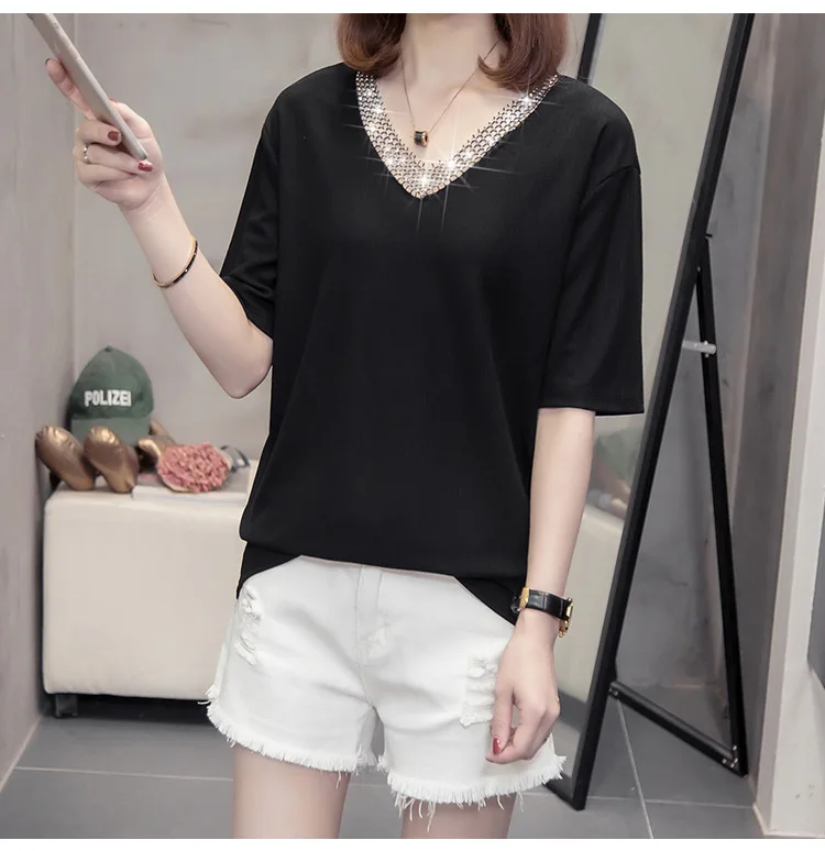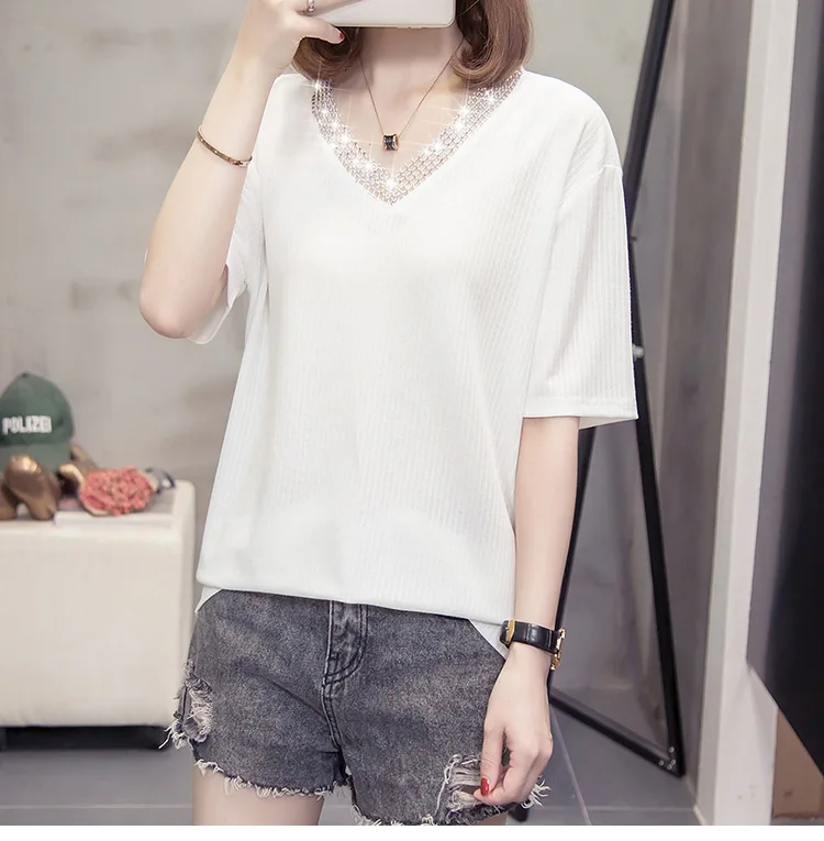 Лето 2021 г. Новая мода корейская футболка с короткими рукавами женская повседневная свободная индивидуальность с v-образным вырезом и бриллиантами женские топы