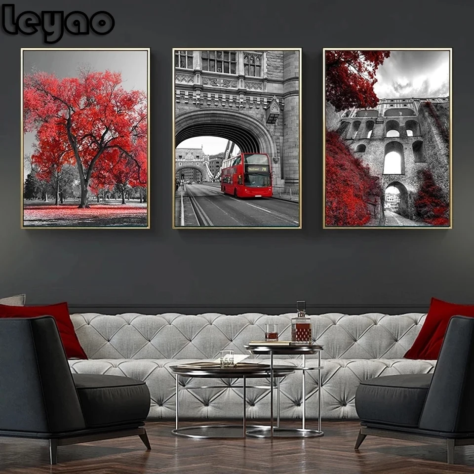 Черно-белое красное дерево Пейзаж Алмазная картина украшение на стену картина-Триптих городской зонтик Бриллиантовая вышивка с изображением дерева
