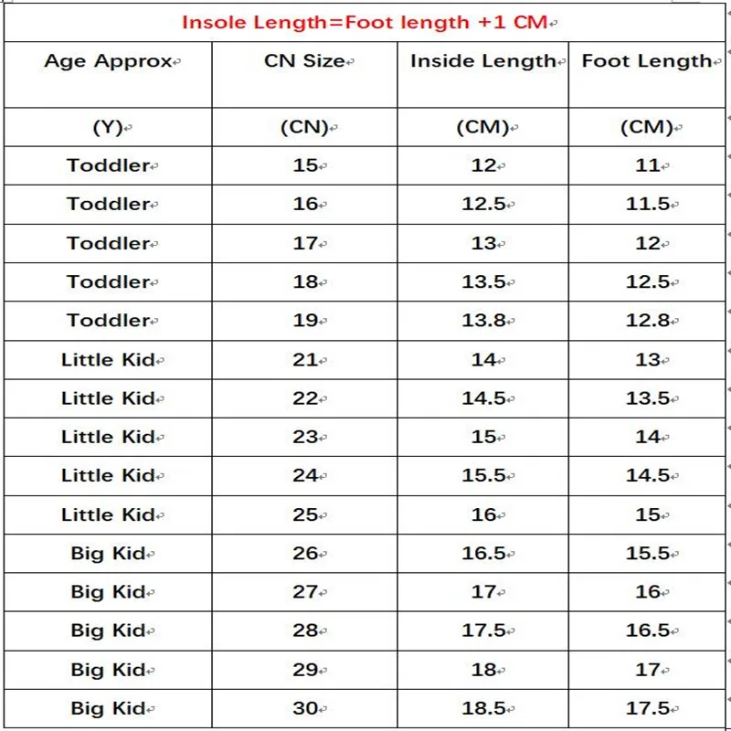 Когда вы заказываете детскую обувь,Вы должны соответствовать длине стельки. (длина стельки = длина стопы + 1 см)Американский размер не является стандартным, просто удобно для вас сделать заказ.Удобная длина стопы составляет около 1 см.И из-за длительного времени доставки авиа-отправление Почты Китая и ребенок быстро вырастет, пожалуйста, выберите обувь большего размера для вашего ребенка.Пожалуйста, выберите правильный размер.