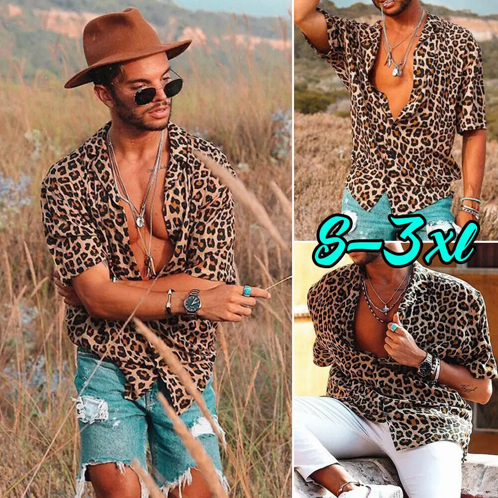 Праздничные Гавайи Стиль мужские короткий рукав с леопардовым принтом Свободная рубашка Повседневное Однобортный рубашка дышащие мягкие Turnleneck Топы