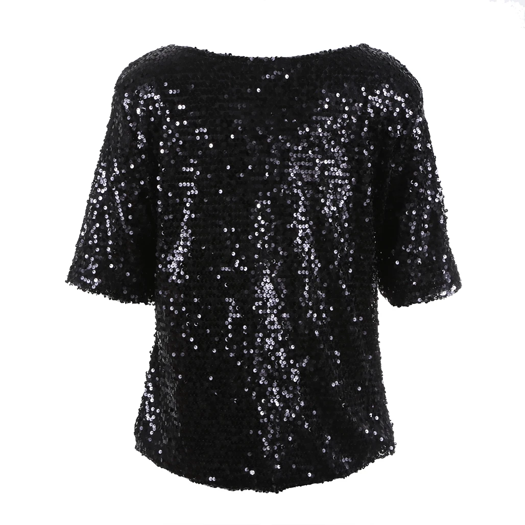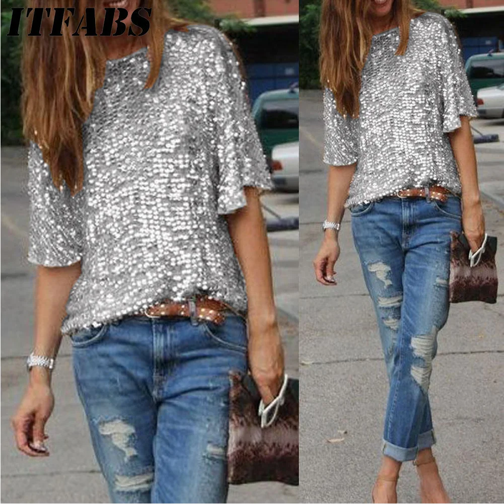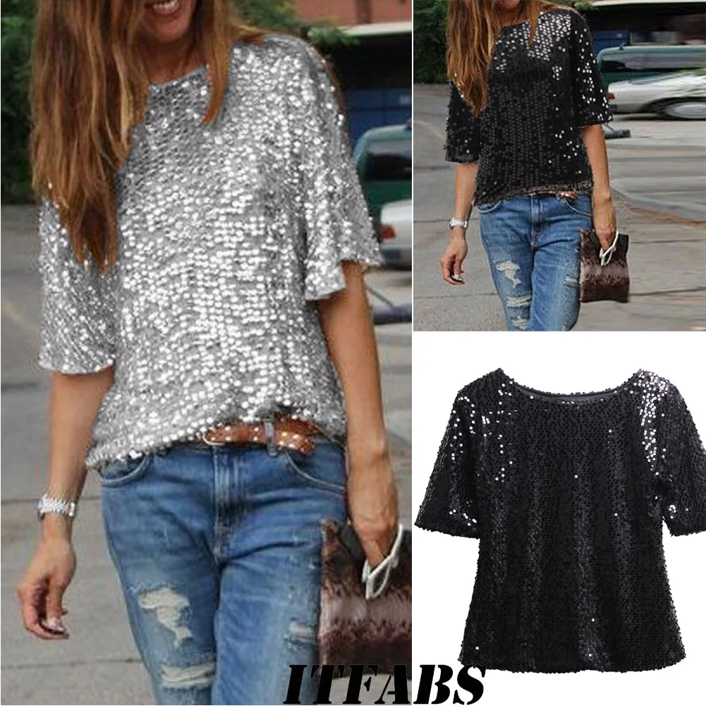 Новые модные женские туфли на высоком каблуке, летние женские туфли с коротким рукавом и круглым вырезом, футболка с блестками повседневные топы зауженного кроя черный, серебристый цвет
