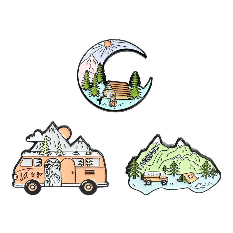 Эмалированные броши для друзей, значок для туриста, автомобиля, тура, автобуса, Автодома, Луны, гор, Мультяшные значки