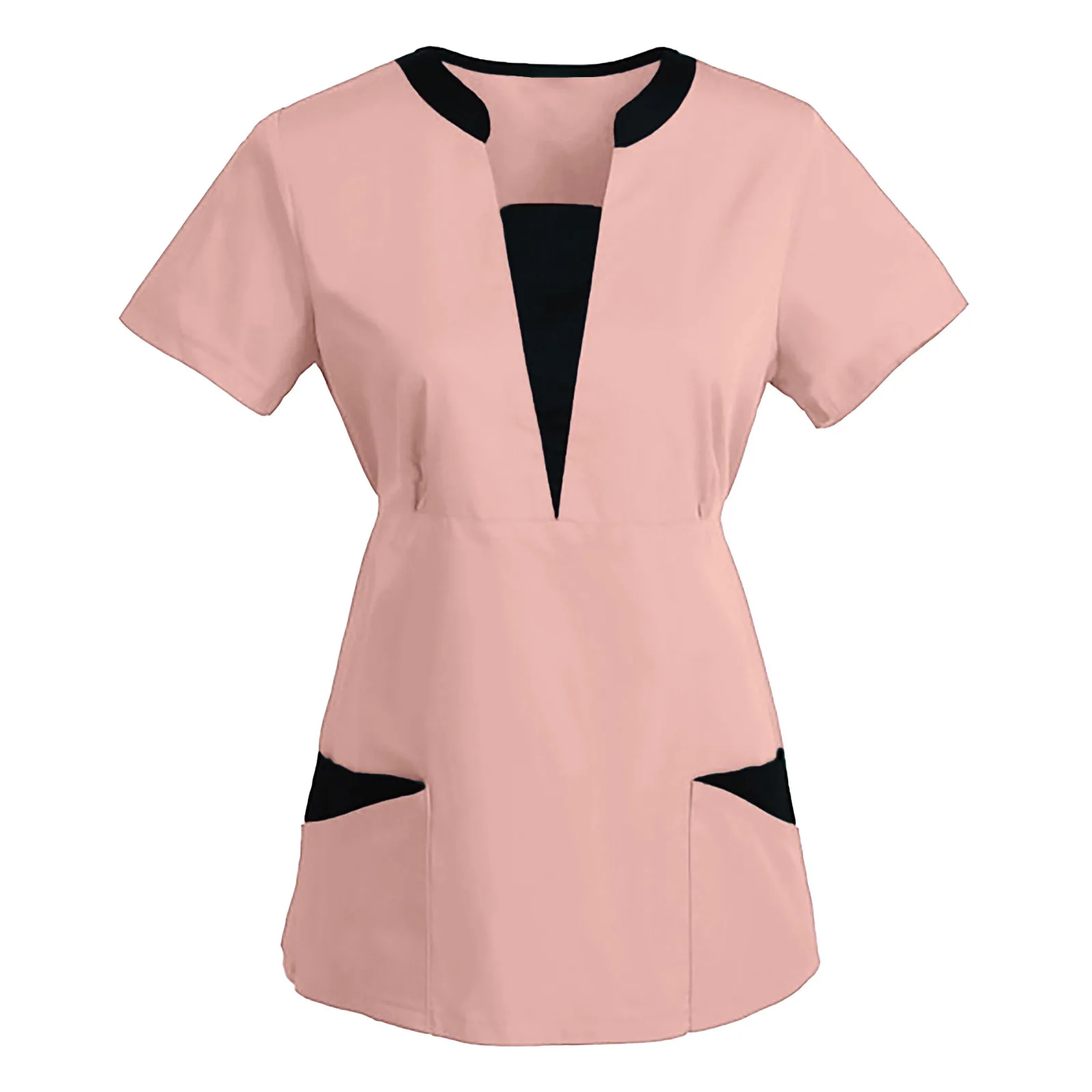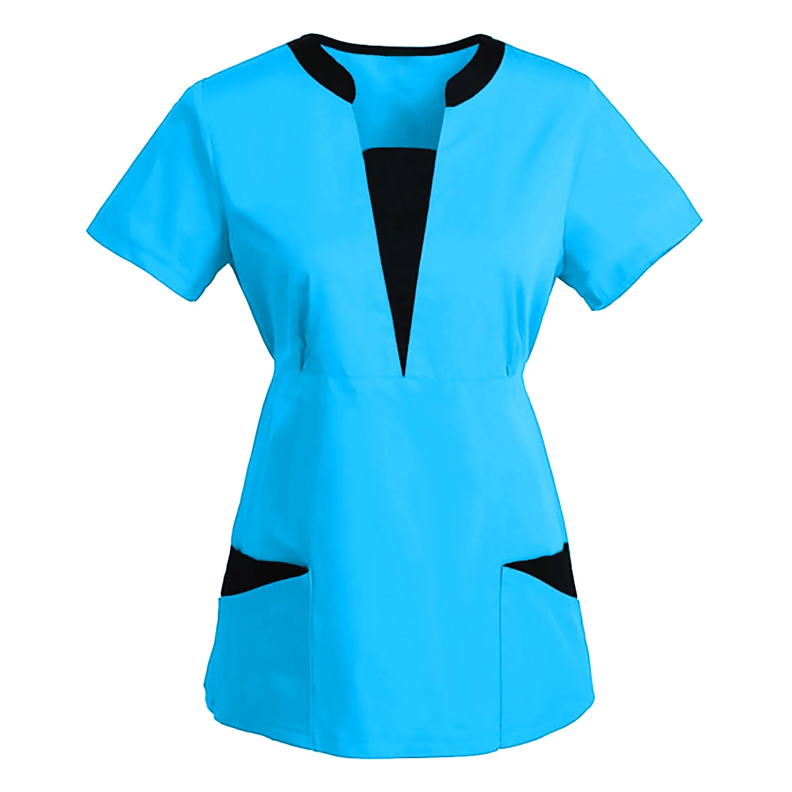 Блузка женская с коротким рукавом, v-образный вырез, однотонная, с карманами, в стиле пэчворк