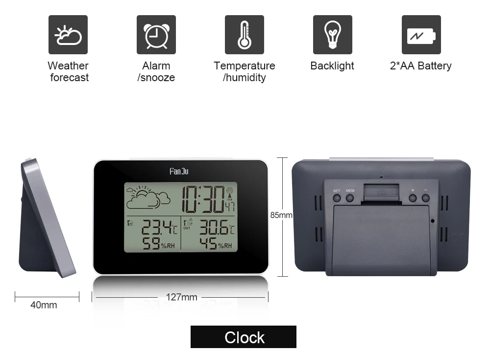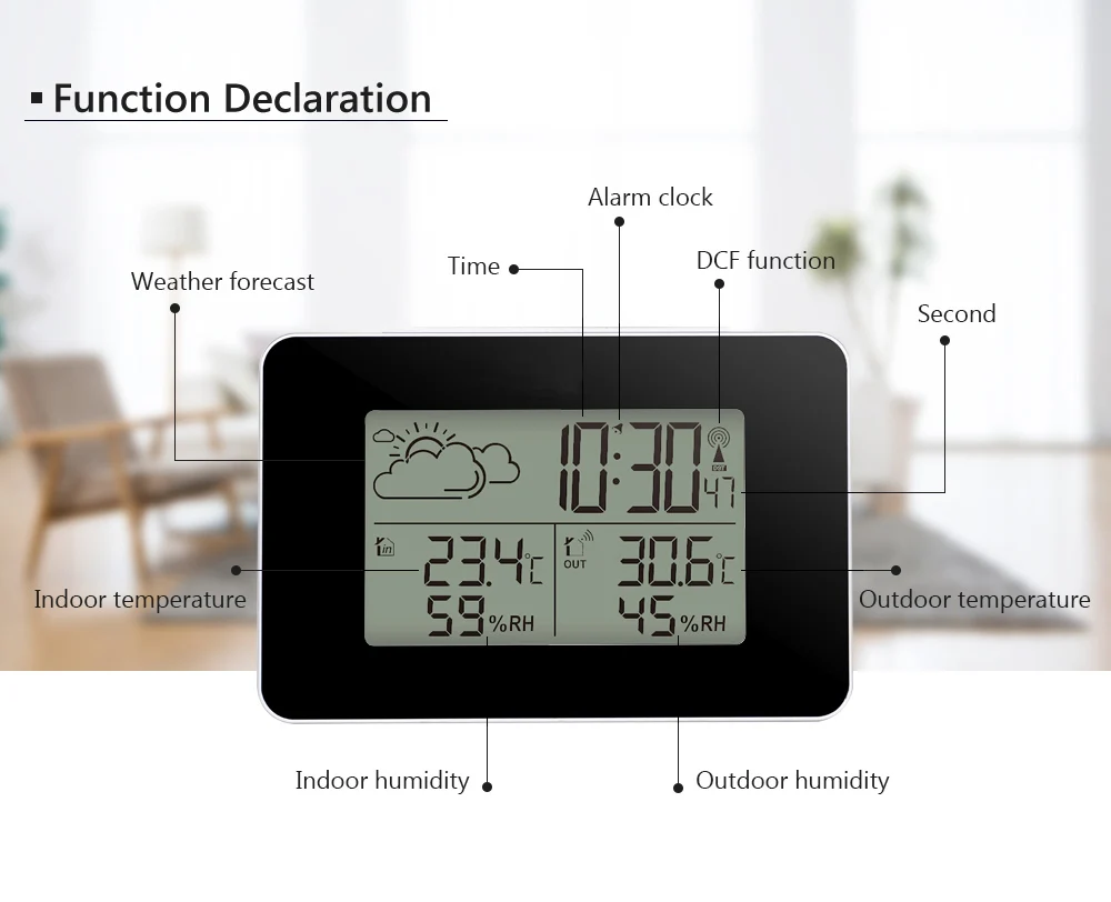 1. Функция радиоуправления DCF (эта функция только для Германии)2. Время в опциональном формате 12/24 часов3. Функция будильника на каждый день4. Функция повтора (ВЫКЛ или 1 ~ 60 мин)5. Низкий уровень заряда батареи6. Влажность: внутренний и наружный измеряемый диапазон: 20% RH ~ 95% RH7. Температура:-Диапазон измерения температуры в помещении:-9,9 °C (14,2 °F) ~ 50 °C (122 °F)-Наружные диапазоны измерения температуры: -25 °C (-13 °F) ~ 50 °C (122 °F)-Температура альтернативно в ℃ или ℉-Наружный термометр, оповещение о льду8. Максимальная/минимальная запись температуры и влажности9. Функция прогноза погоды10. Дисплей с подсветкой