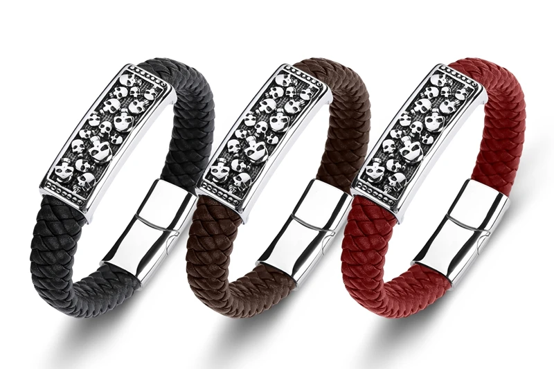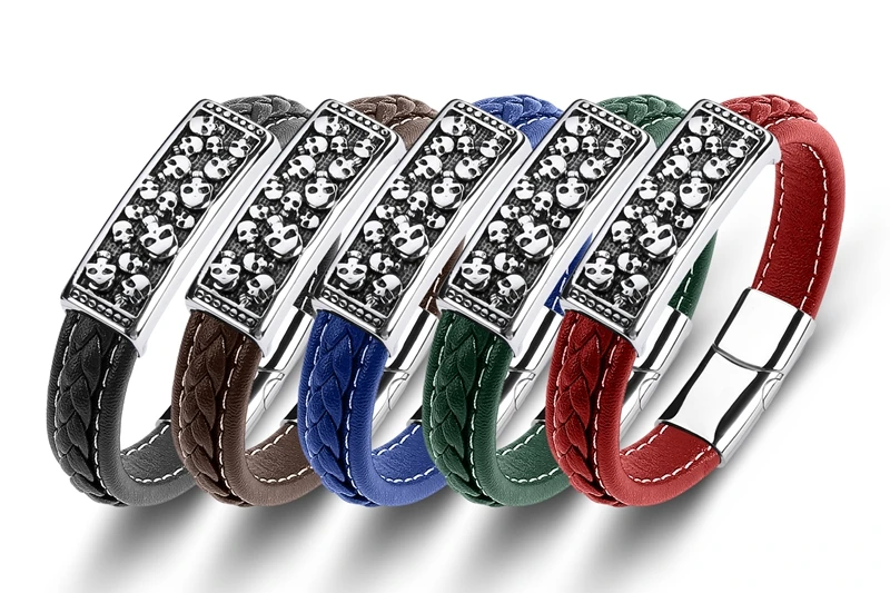 Новые модные кожаные браслеты со скелетом из нержавеющей стали, мно...