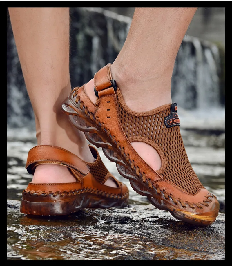 Сандалии мужские сетчатые водонепроницаемые, дышащие Нескользящие пляжные босоножки, повседневная обувь для активного отдыха и походов, кожаные, черные, размер 38-46